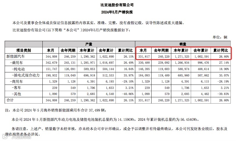 6月2日,比亚迪披露的最新销量数据显示,公司5月新能源汽车销量33.18万辆,上年同期销量24.02万辆。1至5月,公司新能源汽车销量累计127.13万辆,同比增长26.80%。