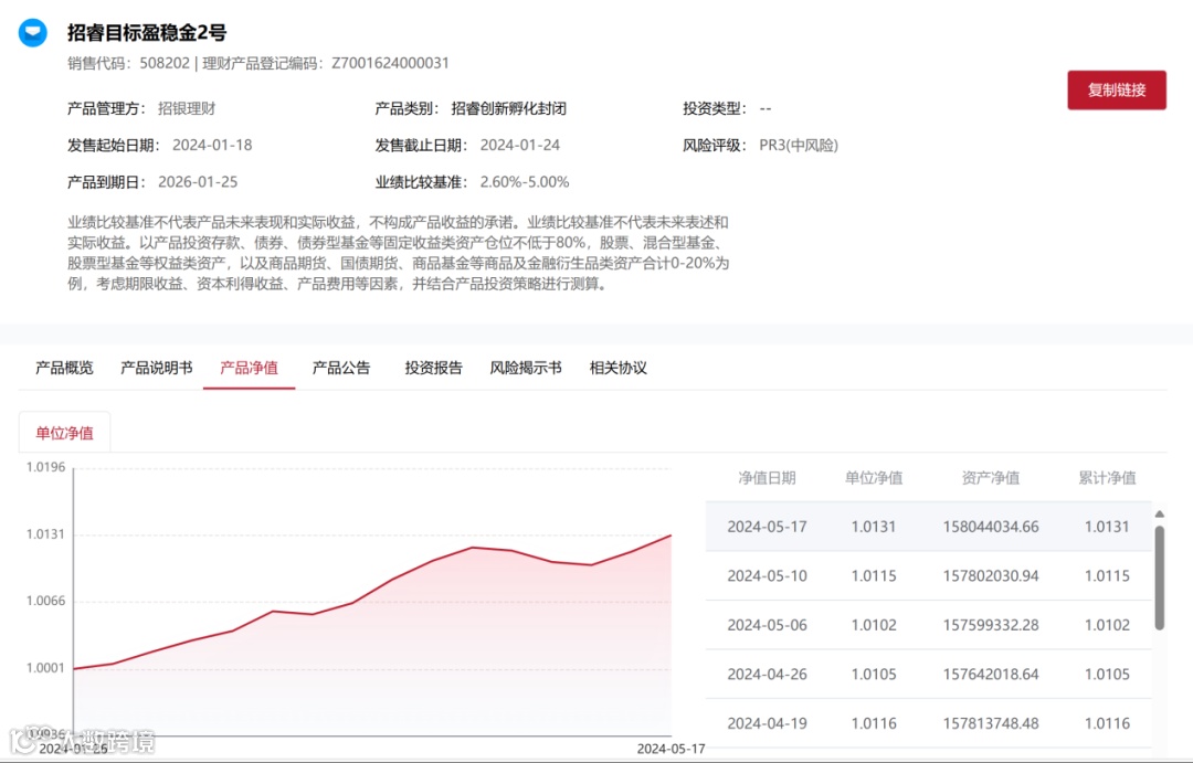 招银理财旗下“招睿目标盈稳金”系列“含金”理财产品净值创成立以来新高。如5月17日招银理财招睿目标盈稳金2号固收增强理财计划公布最新净值为1.0131元,该理财计划于今年1月25日成立,成立以来年化收益率达4.29%。其底层资产配置中枢为80%债券+10%黄金+10%量化中性,业绩比较基准为2.60%至4.50%。