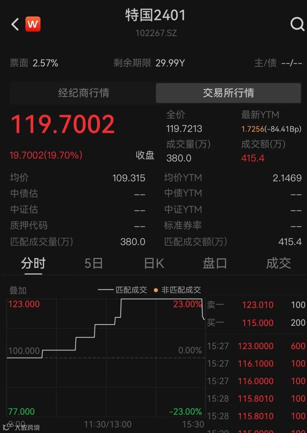 Wind数据显示,截至14:04,特国2401(102267)报123.00元,涨幅达23%。