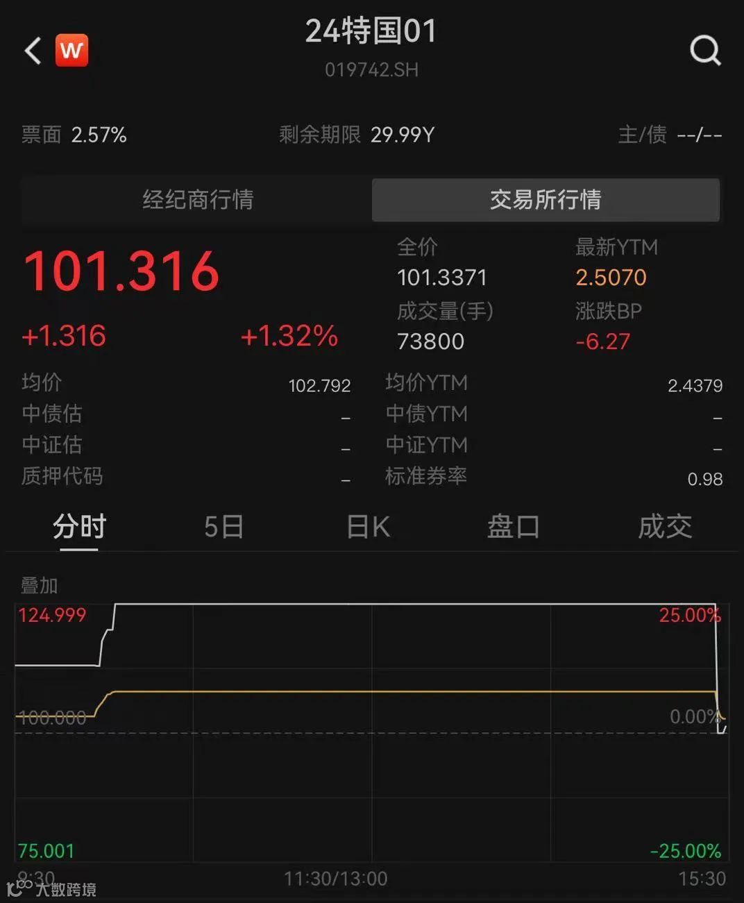 深交所方面,30年期固定利率附息债的证券编码为“102267”,证券简称“特国2401”,发行总额400亿元,票面利率2.57%,也在盘中两次临停。