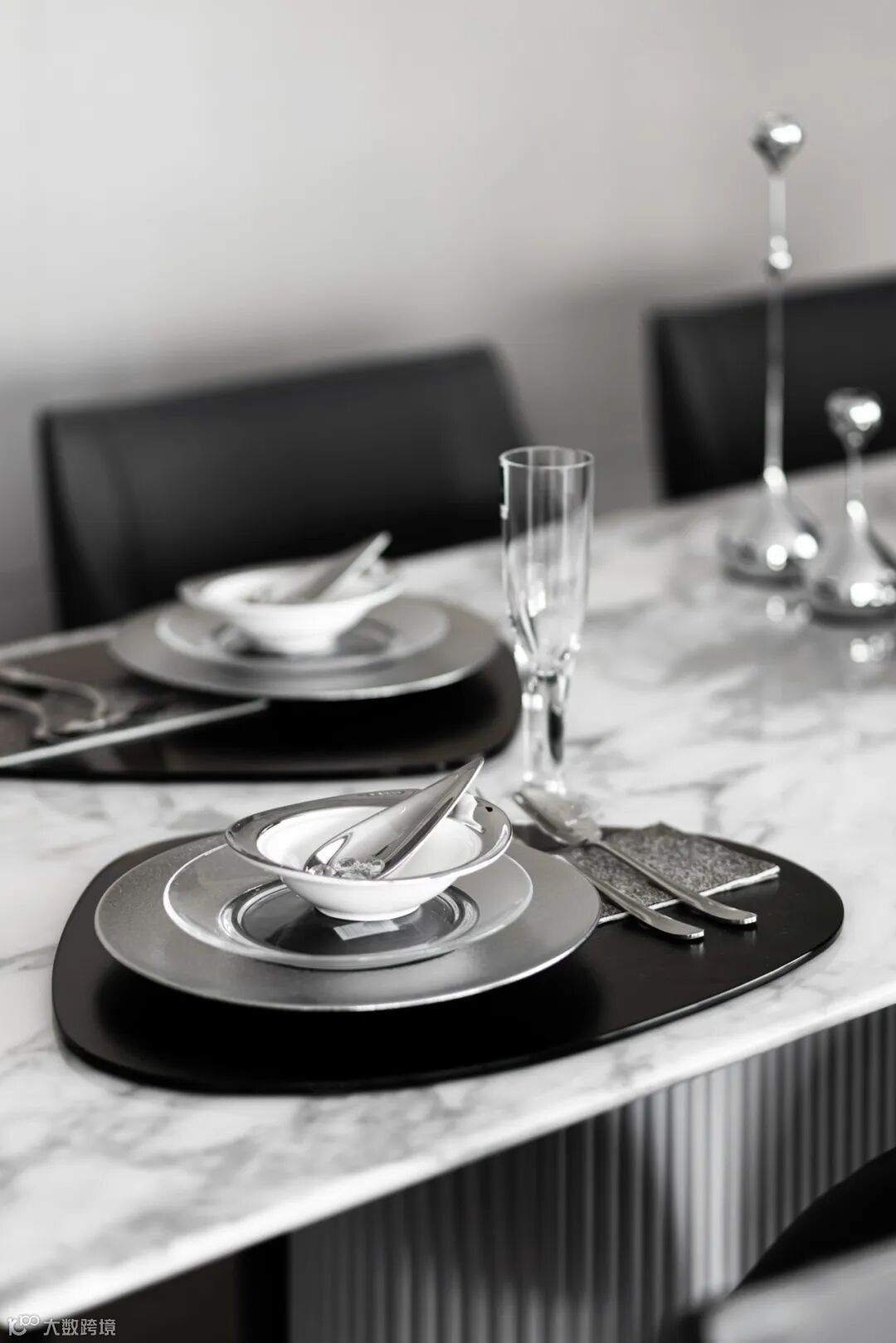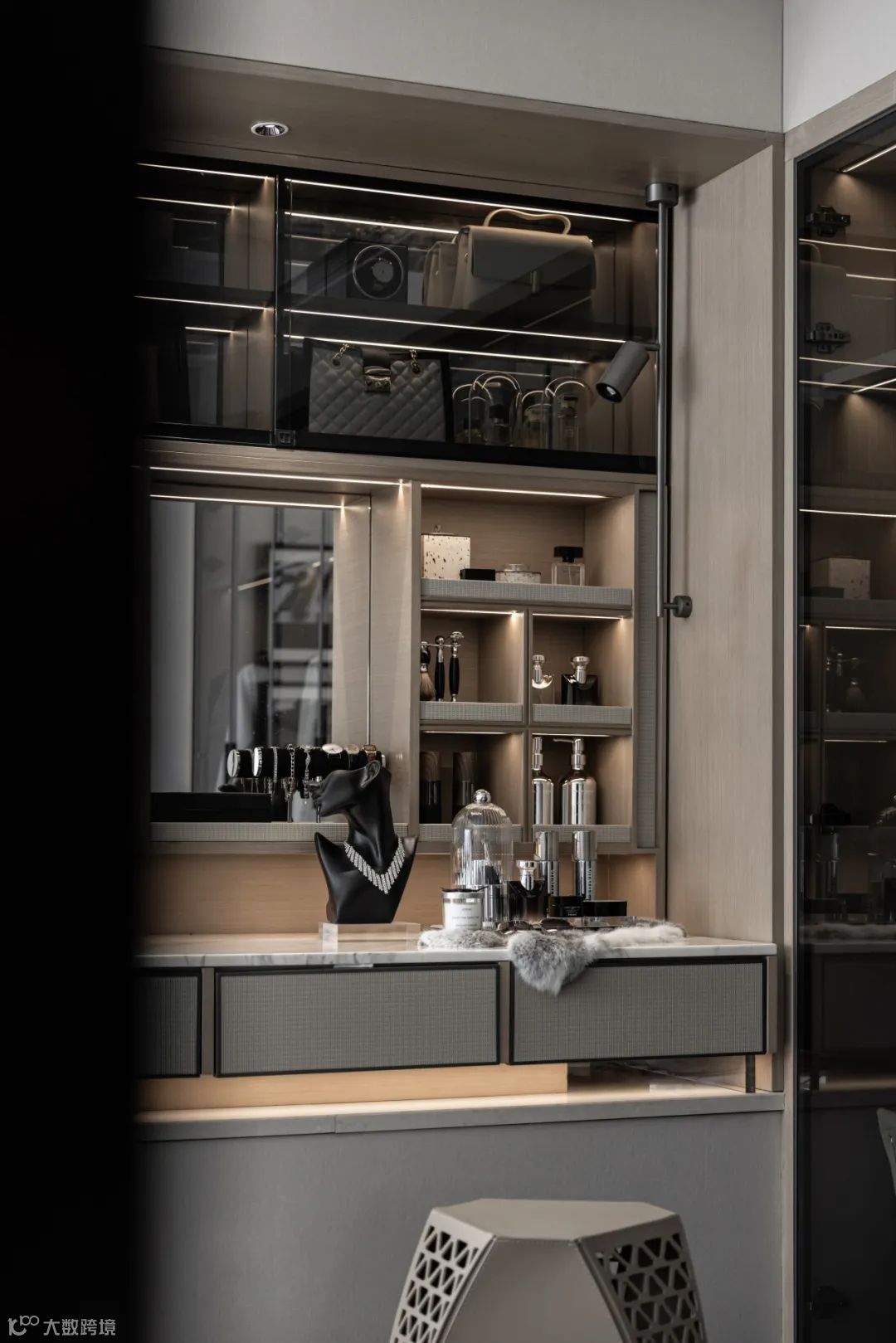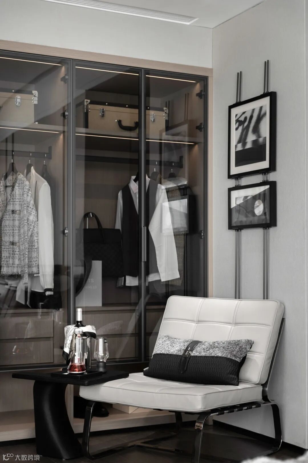 空间以黑白灰的中性气质为基底,辅以反射性的天然石材与金属质感材料,暗示出空间的干练与硬朗,散发强烈的现代审美与精英气质,呼应现代都市新贵族对于自我身份认同的需求。
