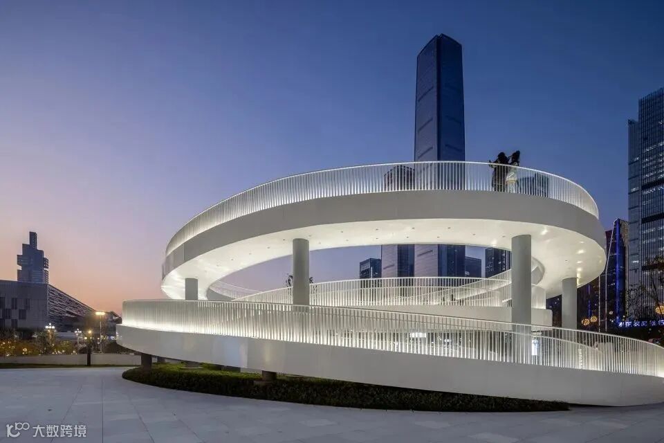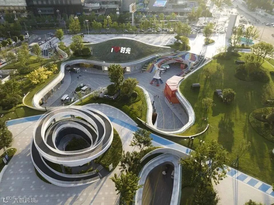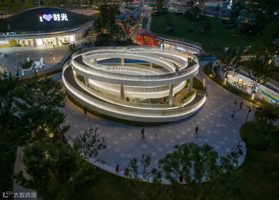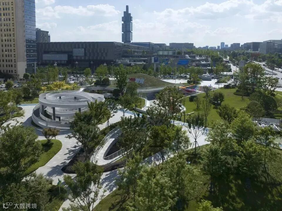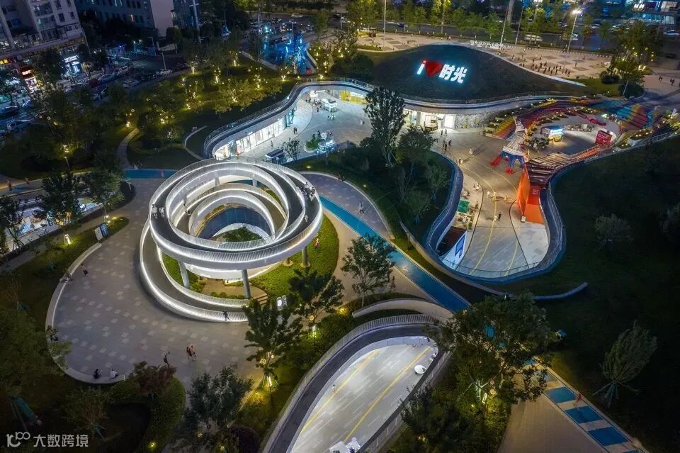 设置在公园的螺旋坡道是连接公园与商业的重要节点之一,也是公园的景观地标,人们可以登高,仰望城市的繁华,俯瞰公园的绿意盎然,还可以在这里汇合。