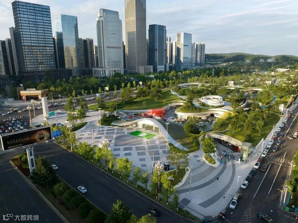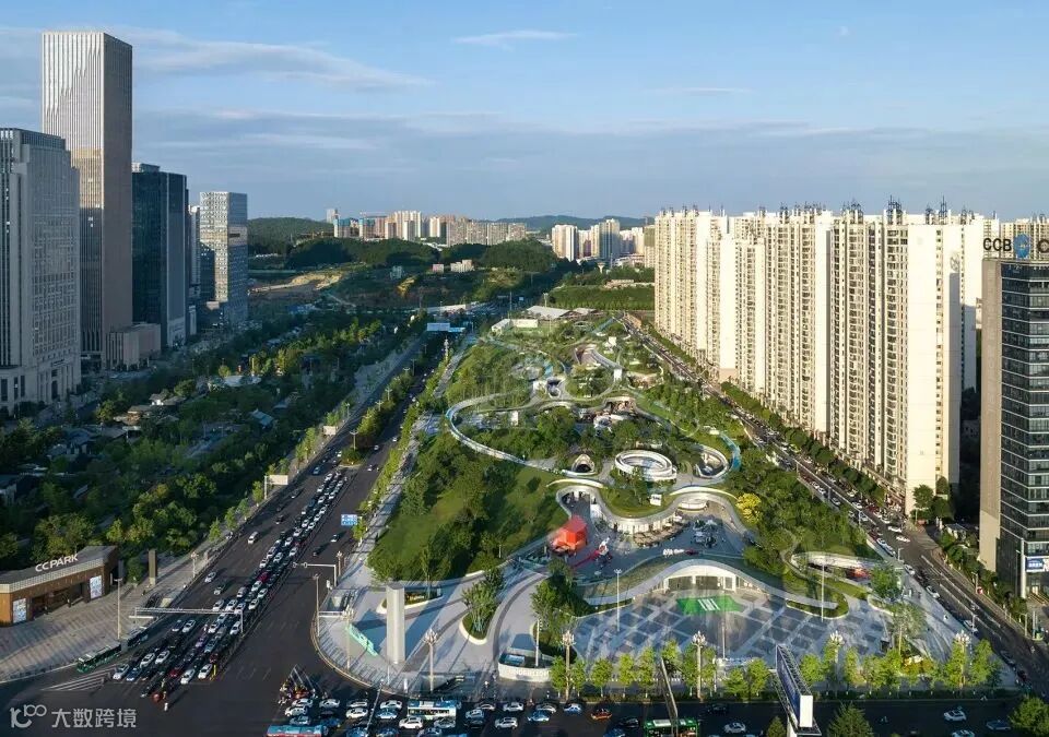 项目位于山城贵阳市观山湖区CBD中心区,占地面积约88000㎡的城市绿地,周边高楼林立,身处其中,很难将这个城市与山城联系起来,但是行走在其中仍旧能感受到大尺度的坡度和不平坦的台地,而不远处城市边缘连绵的山丘也足以证明其山城的身份。