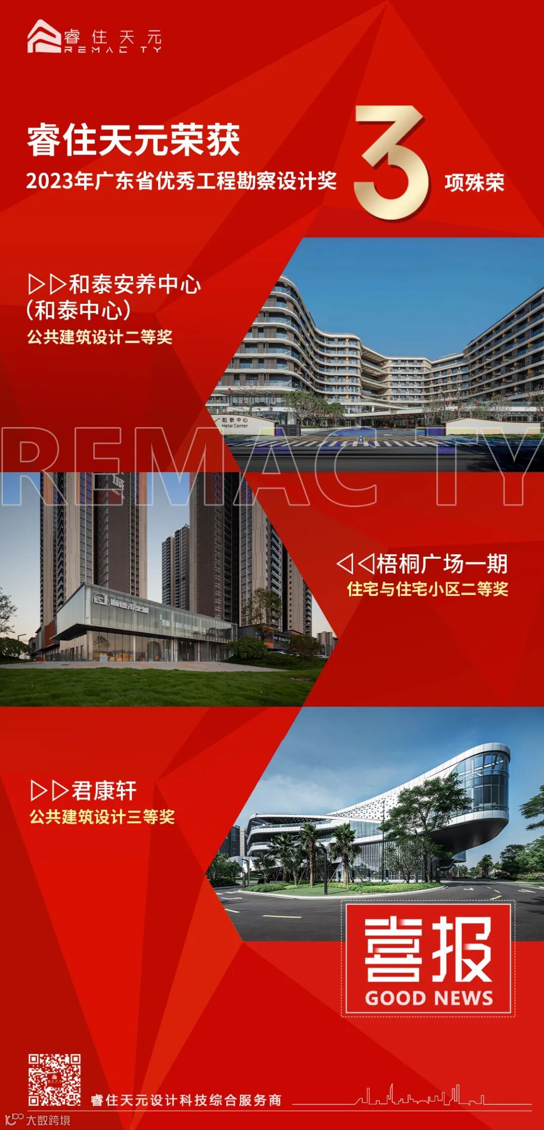 和泰中心获公共建筑设计二等奖、梧桐广场一期获住宅与住宅小区二等奖、君康轩获公共建筑设计三等奖。