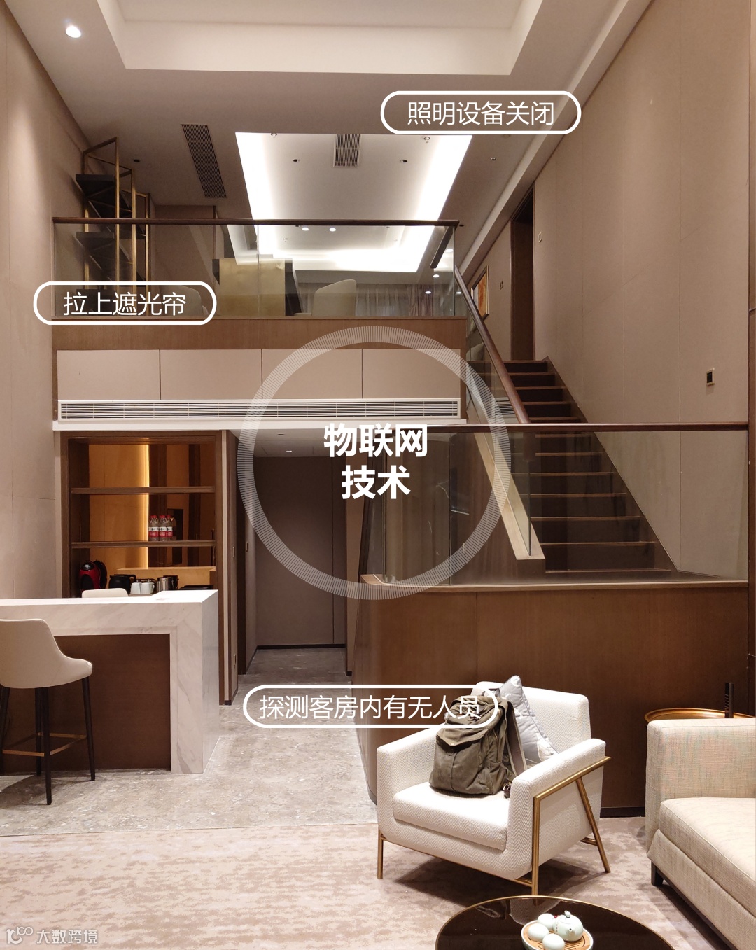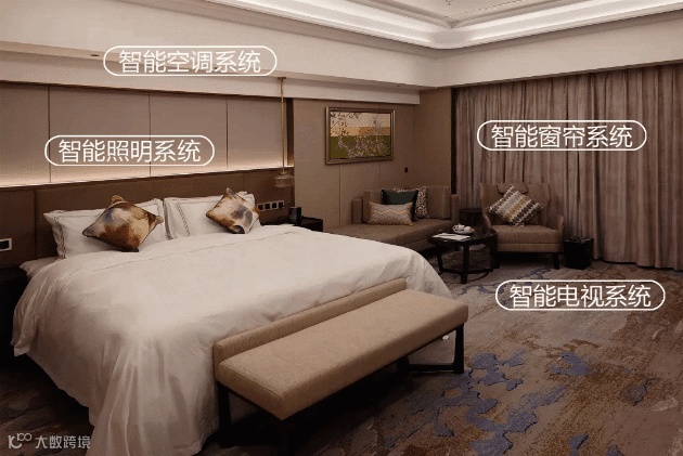 电梯通过人脸识别将客人送至相应楼层,房门采用人脸识别系统。智能语音控制系统可通过语音对房间灯光、电视和窗帘等设备进行控制。
