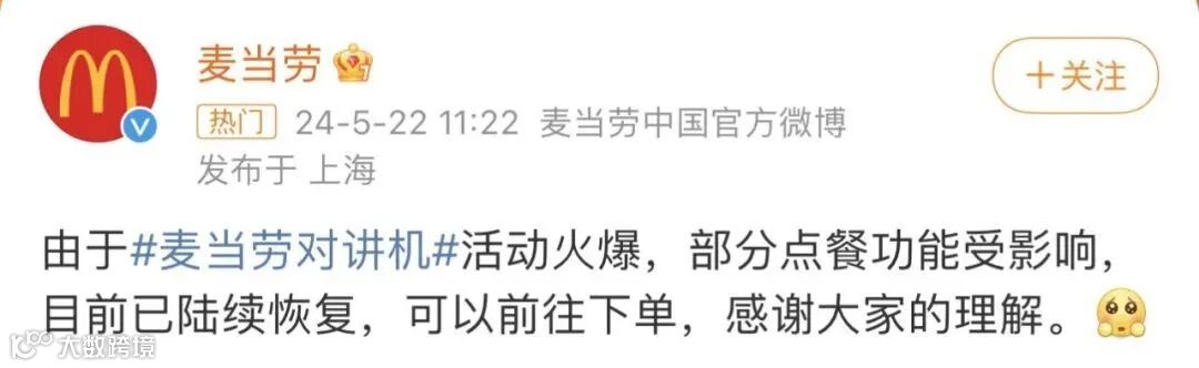 麦当劳则回应称,由于“麦当劳对讲机”活动火爆,部分点餐功能受影响,目前已陆续恢复,可以前往下单。