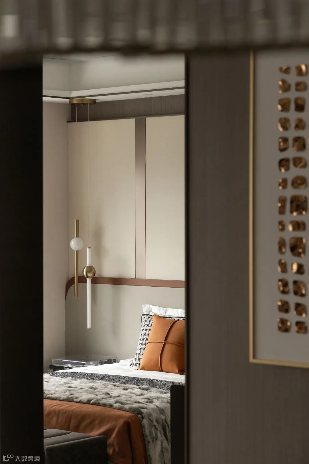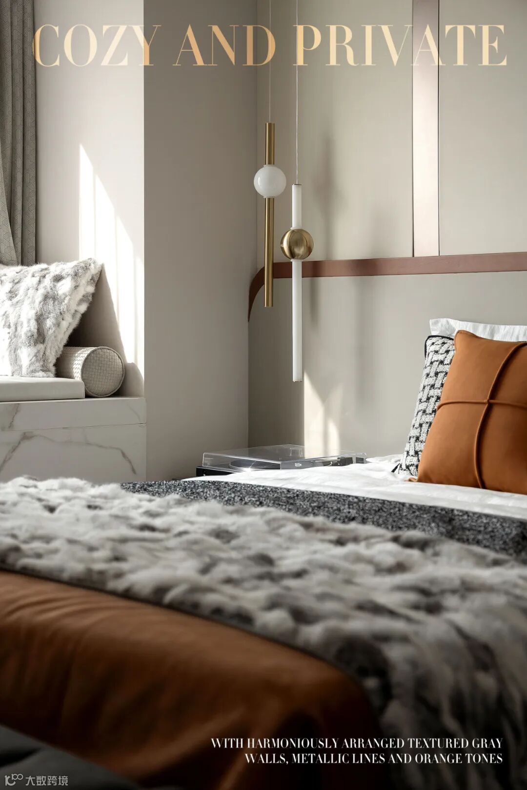 卧室以质感灰墙面、金属线条融合橙调碰撞出默契的陈设艺术,点缀舒适私密的休憩空间。
