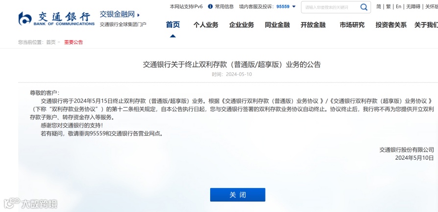 5月10日,交通银行发布公告称,将于5月15日终止双利存款(普通版/超享版)业务。根据相关规定,自公告执行日起,客户与交通银行签署的双利存款业务协议自动终止。协议终止后,交通银行将不再为客户提供开立双利存款子账户、转存资金存入等服务。