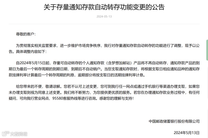 5月13日,邮储银行发布公告称,自5月15日起,存量可自动转存的个人通知存款(含梦想加邮站)产品将不再自动转存,通知存款产品的到期日为最后一个转存周期的到期日期,到期后不自动销户。