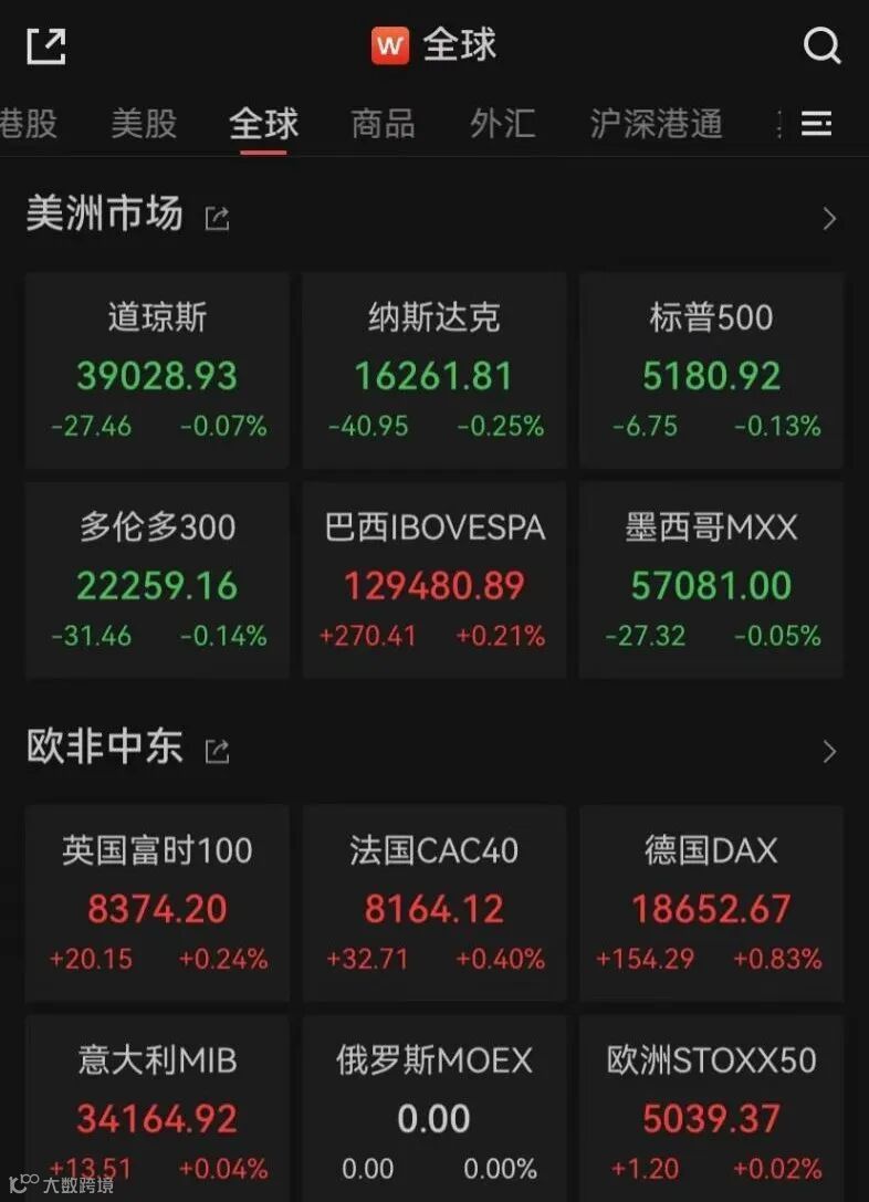 截至北京时间21:42,英国富时100指数涨0.24%,盘中最高触及8394.01点。其他欧洲主要股指盘中也震荡上涨,德国DAX指数涨0.83%,法国CAC40指数涨0.40%;欧洲斯托克50指数涨0.02%。