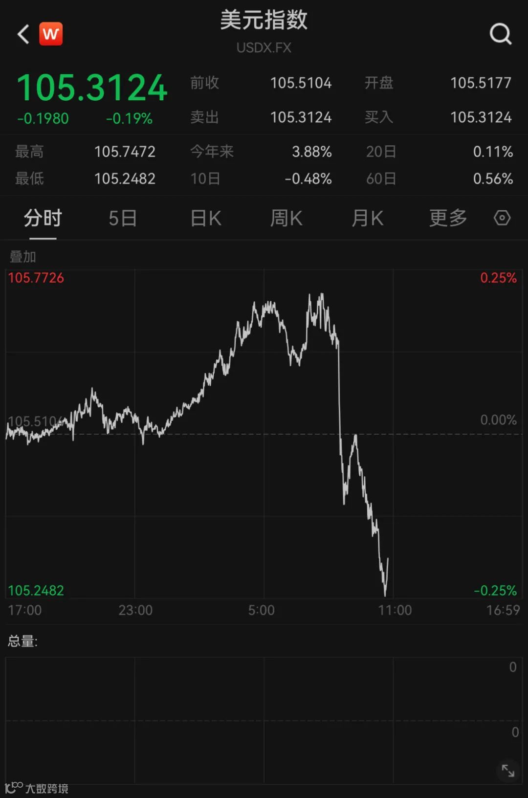上述数据公布后,美元指数下挫。截至北京时间22:46,美元指数报105.3124,跌0.19%。