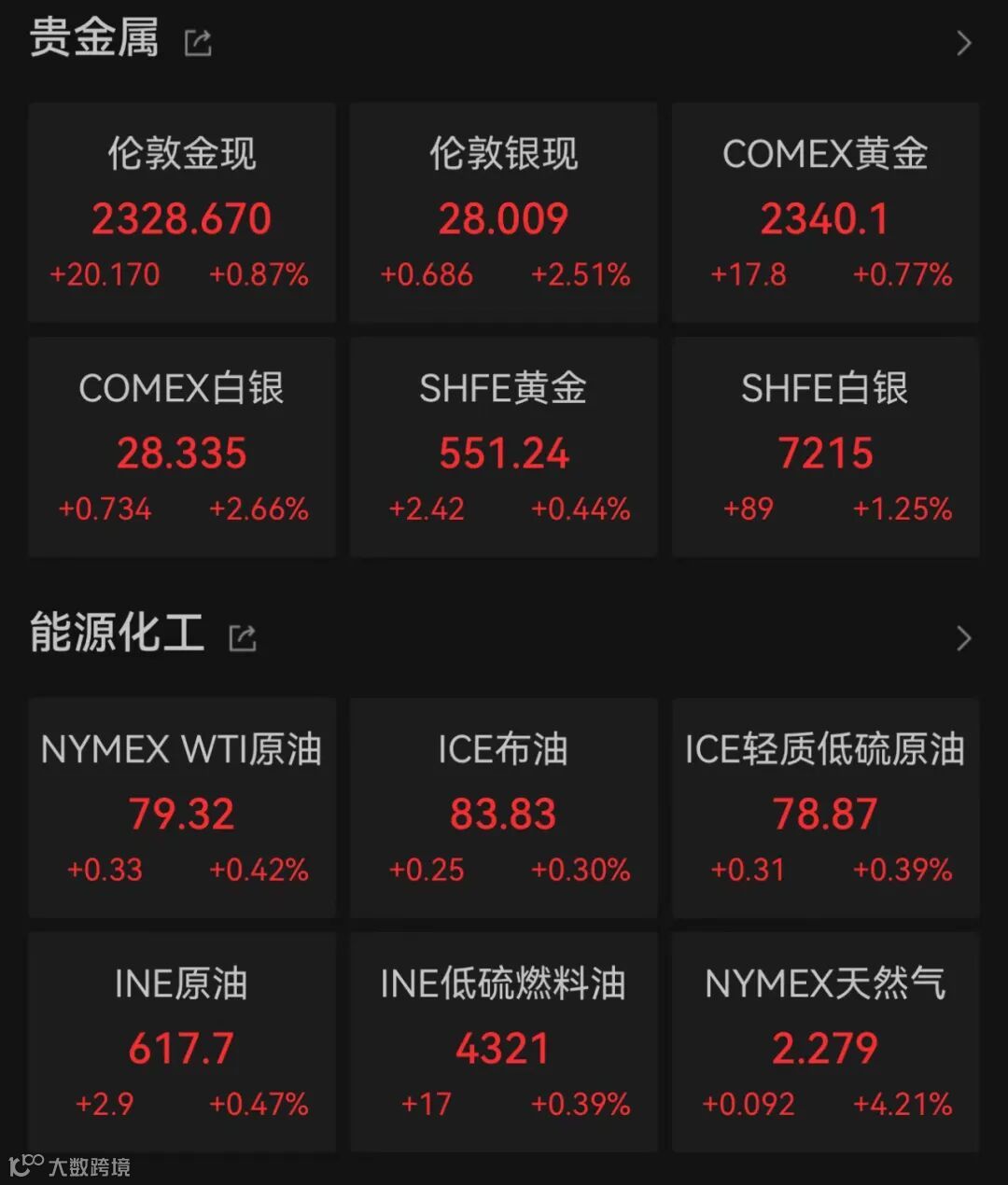 油价方面,WTI原油期货上涨0.42%,报79.32美元/桶;布伦特原油期货上涨0.30%,报83.83美元/桶。