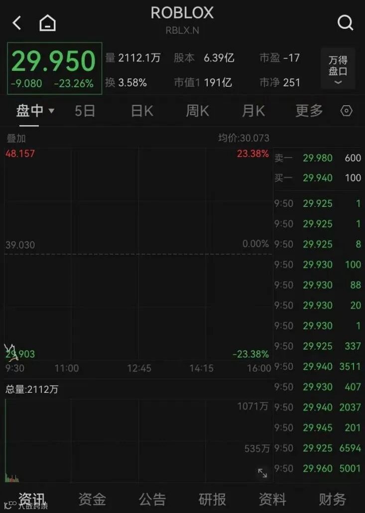 截至北京时间21:50,“元宇宙第一股”ROBLOX股价暴跌超23%,市值日内蒸发58.02亿美元(约合人民币419亿元),最新总市值191亿美元。此前一个交易日(5月8日),该股下跌3.72%。