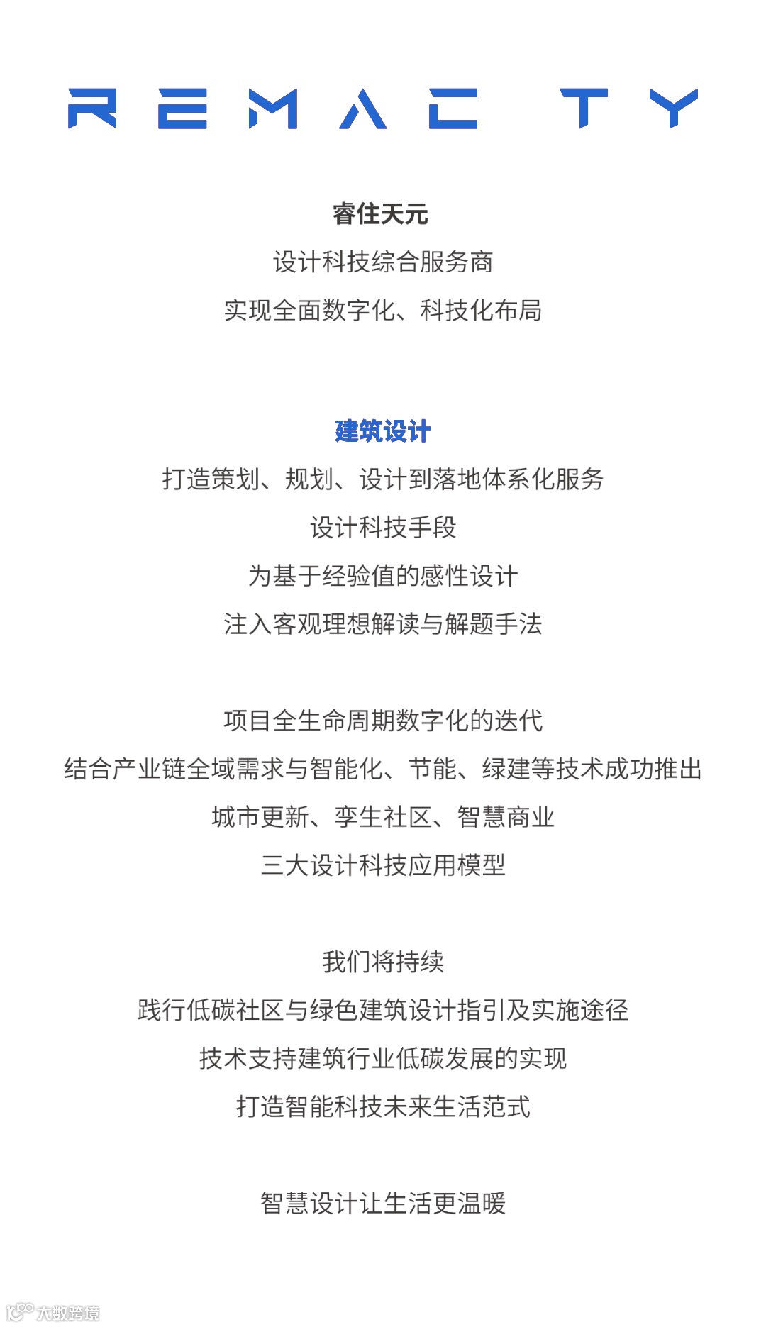 职责中见精神,品质中博取胜。睿住天元定位设计科技综合服务商,专注设计科技产业,打造建筑全生命周期数字化设计,具备全过程全专业设计咨询能力。企业拥有建筑设计甲级、规划乙级资质、园林乙级资质。承接业务包括城市规划、建筑、景观、室内、土建施工图、装配式、BIM、智能化设计,美丽乡村,与EPC&全过程工程咨询服务。业务场景涵盖智慧城市、元宇宙场景、绿色建筑、智慧生活场景、零碳智慧社区、零碳校园、智慧康养、主题文旅、产研综合体、乡村振兴等领域。