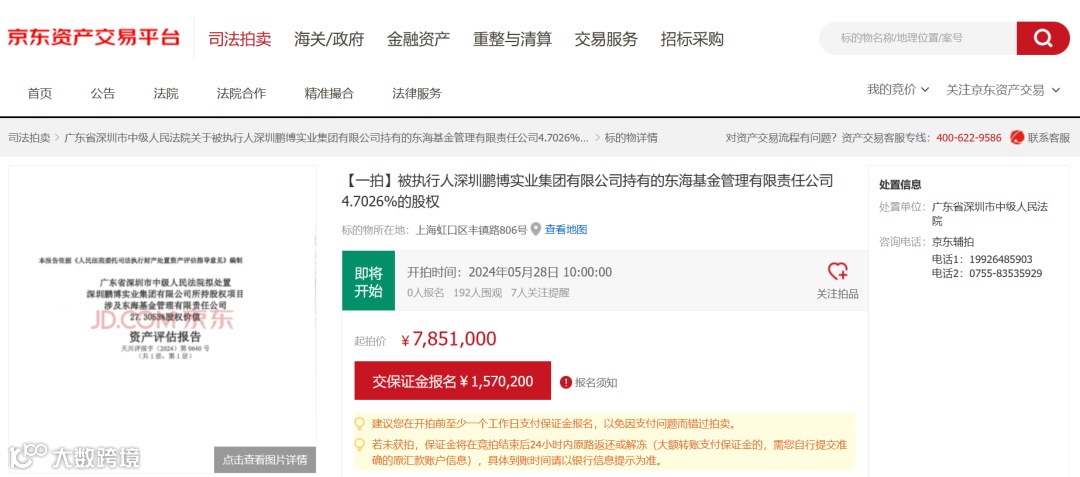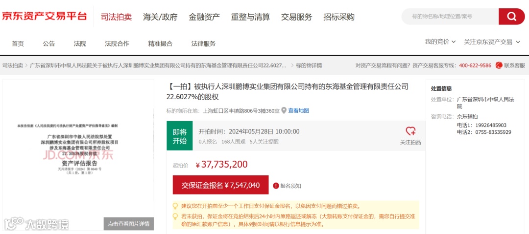 资产交易平台获悉,东海基金27.3053%的股权(出资额为4500万元,评估价值为4558.62万元)遭遇司法拍卖。