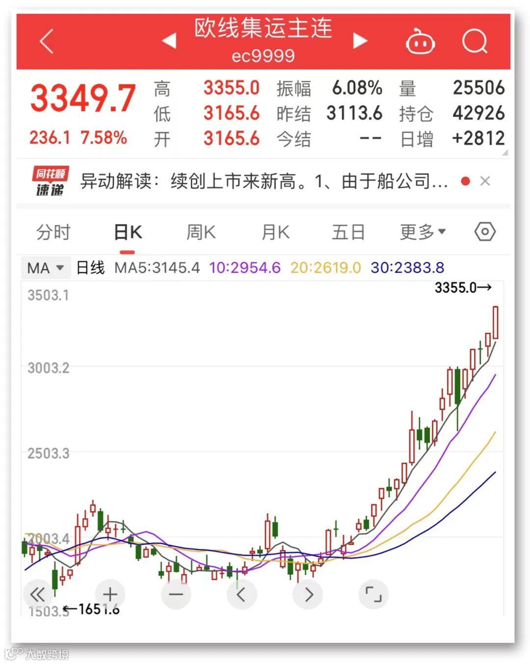 集运指数欧线期货主力合约上午大涨7.58%,再创历史新高。
