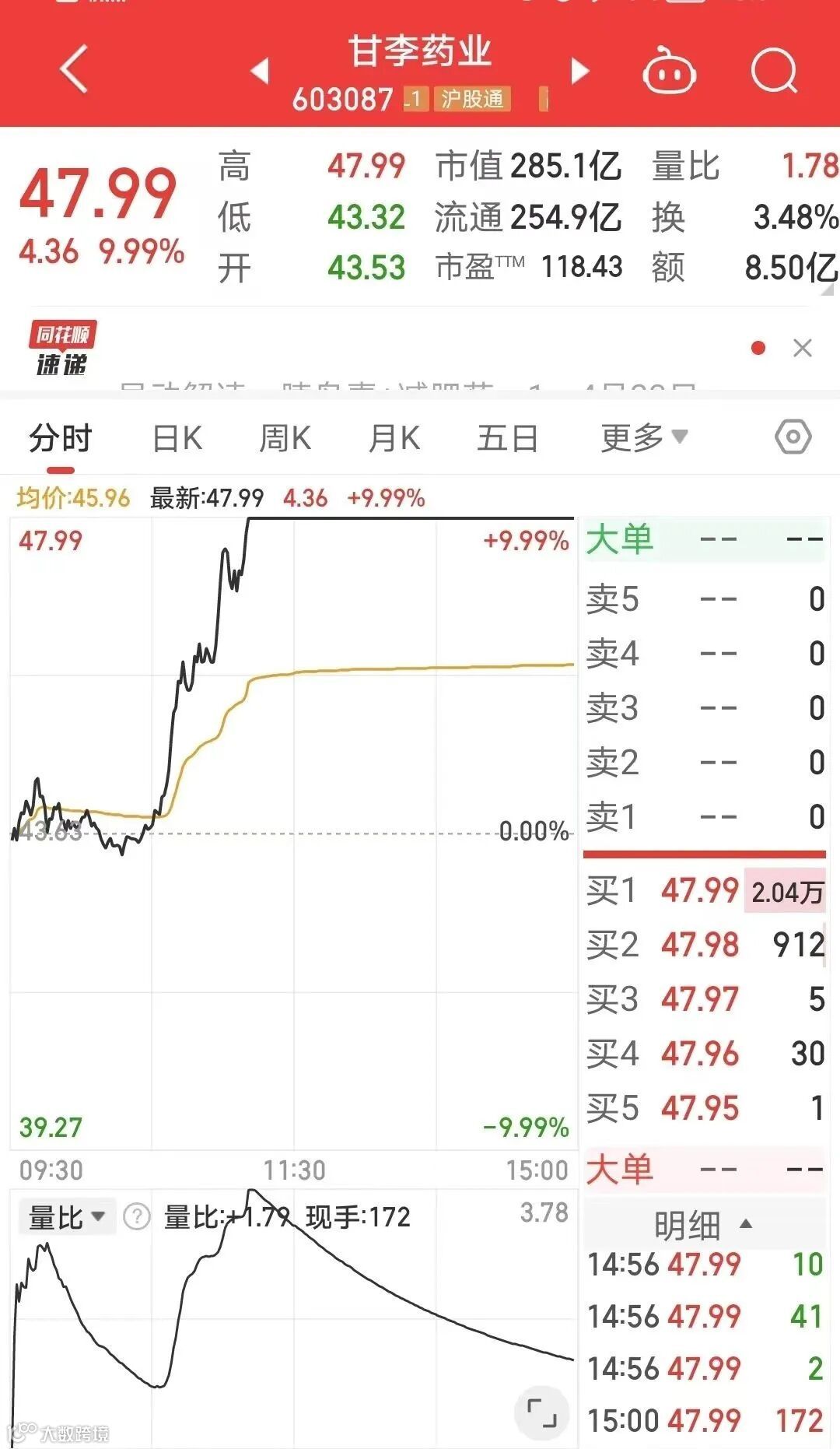其中,甘李药业申报的六款产品全部拟中标,且价格较上一次国采均有所上浮,好于预期。受该消息提振,甘李药业4月23日股价涨停,收盘报47.99元/股,总市值逾285亿元。