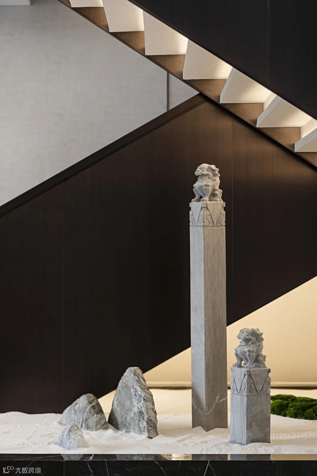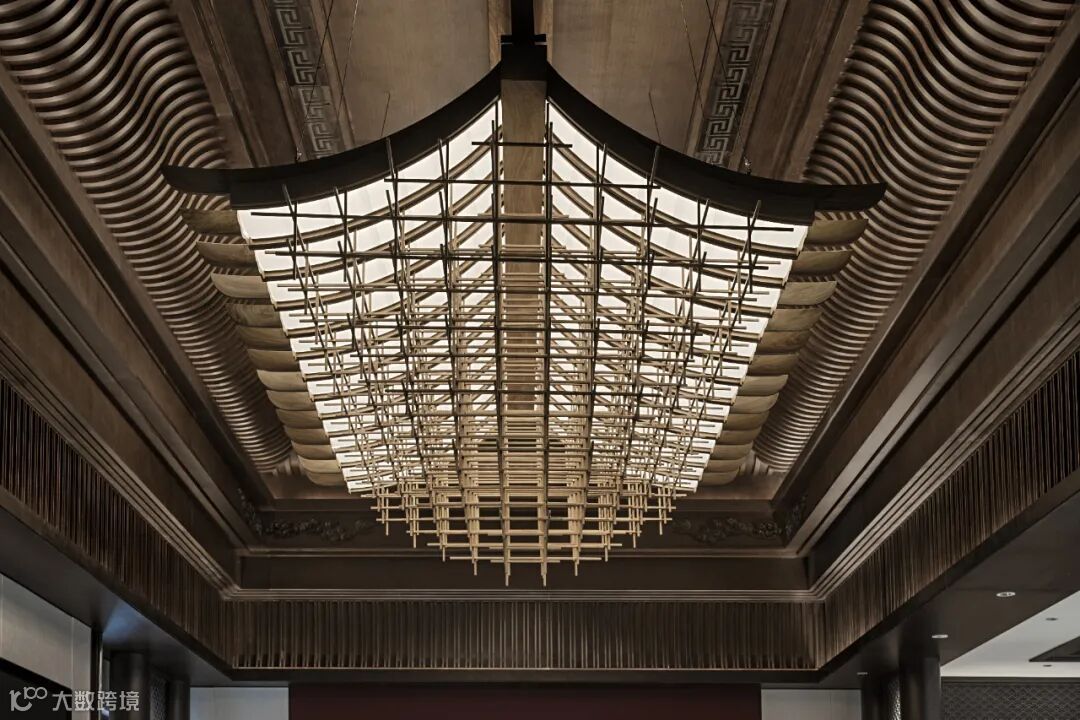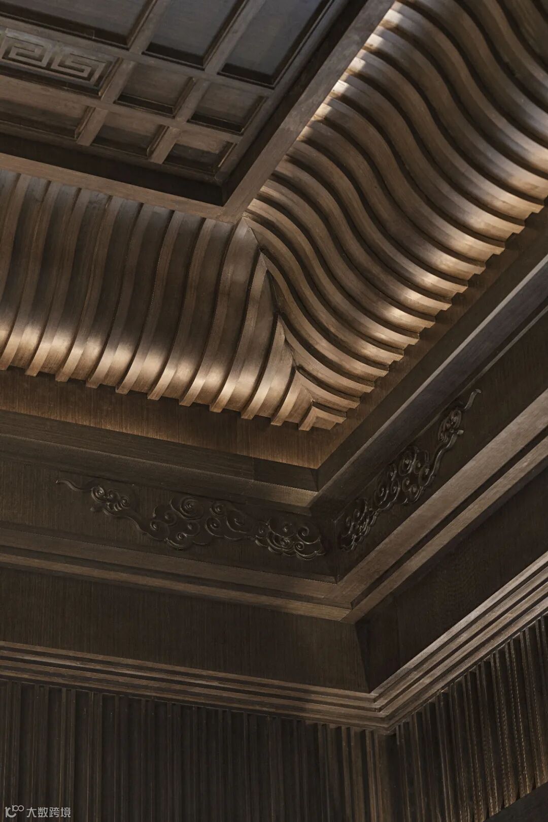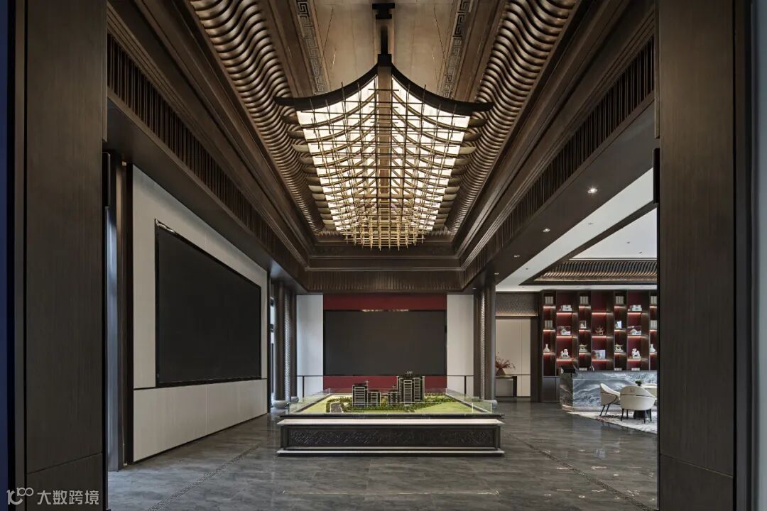 转入沙盘区,入眼是一片阔大高耸的大宅屋顶。仰观屋宅形制,以古代三顶之一的叠梁顶为原型加以修饰手法改制而成的屋顶,令空间多了些山峰傲骨、波澜壮阔的崇高意味。四角用古代云纹纹理修饰的屏风与檐柱加以支撑,以沉稳之方为顶,以精巧之屏为基,方直之美,营造出一种灵动的禅意。