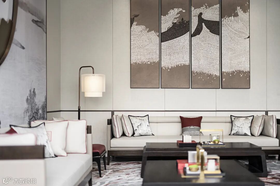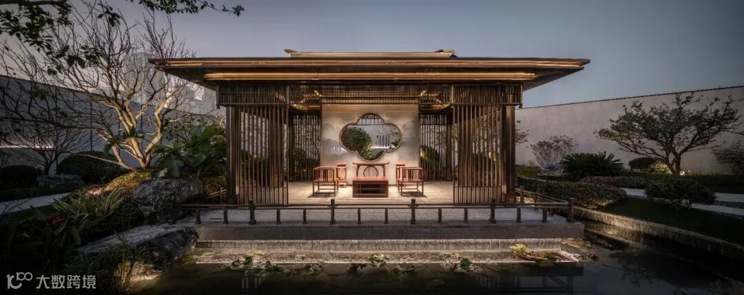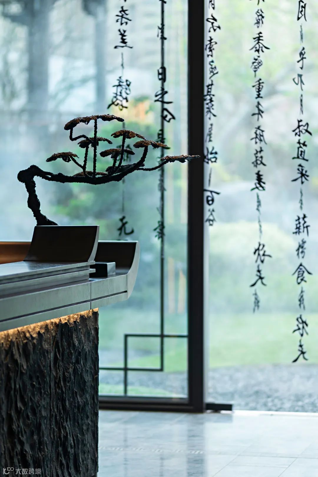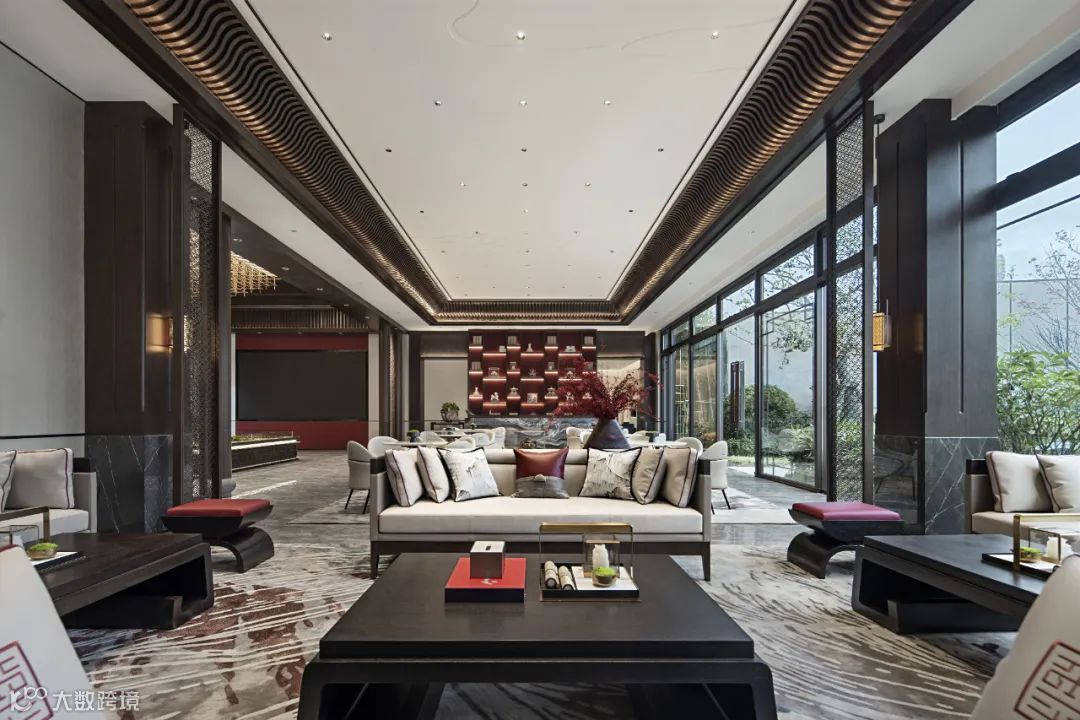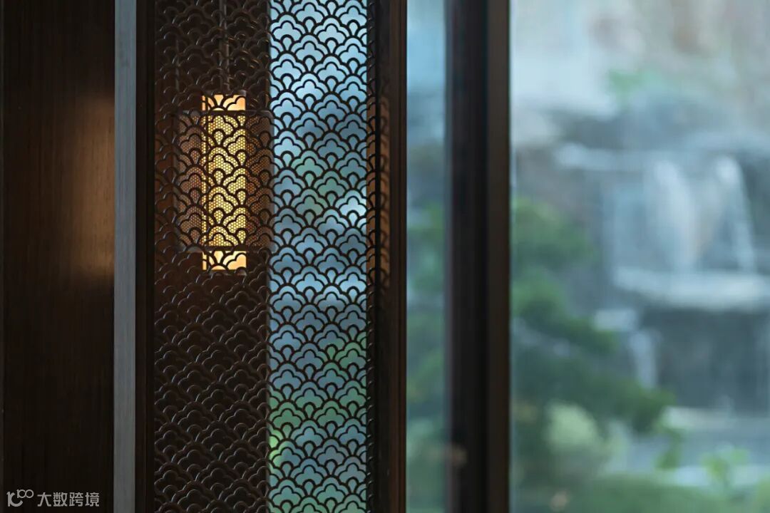 禅意十足的苏州园林,通过大面积的落地花窗无缝引入到室内,最大限度的营造中式庭院大宅由内到外的视觉冲击。