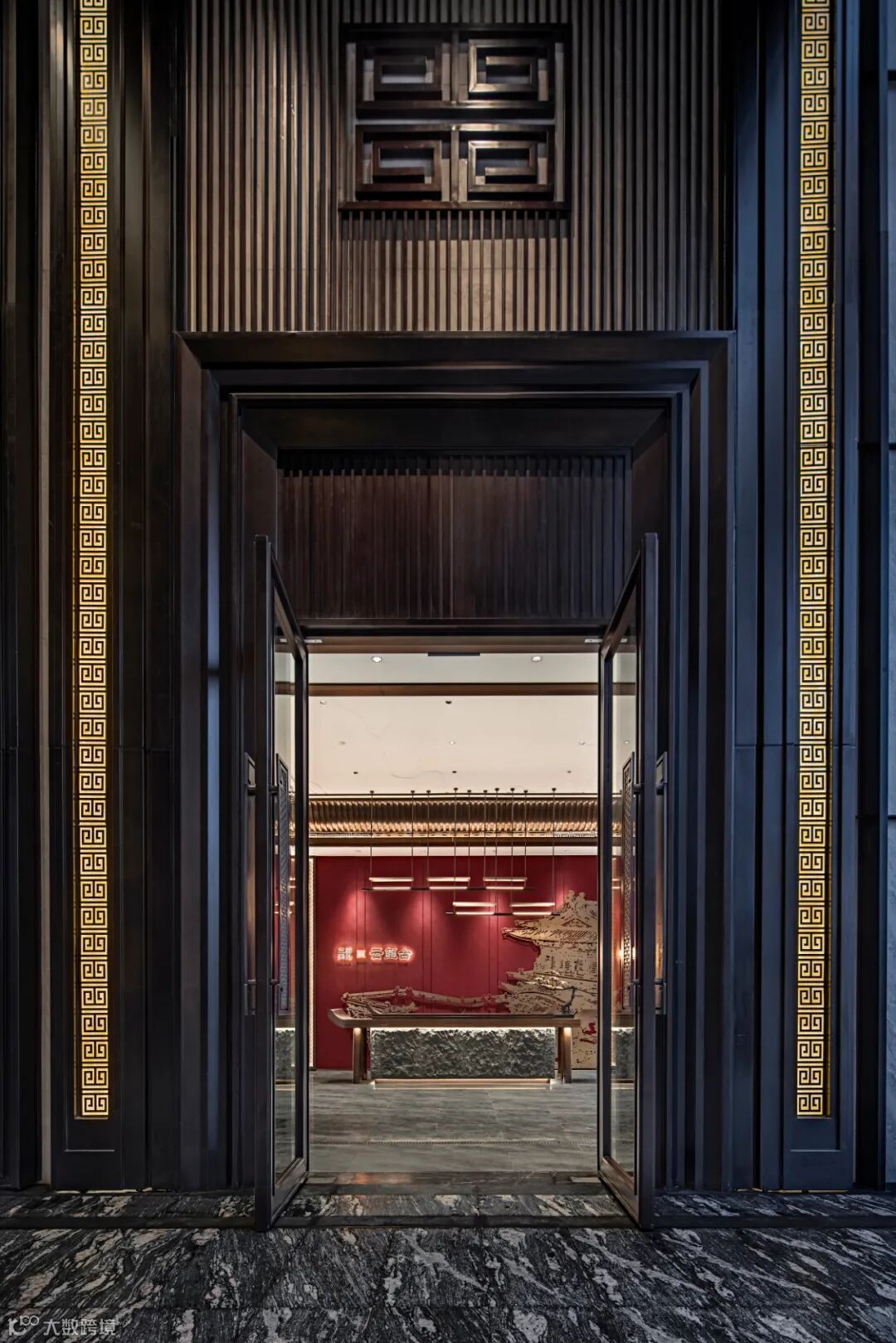 通过两扇王府大门,穿过威武庄严的门庭进入到前厅,映入眼帘的是衬托在一片古典红中的金黄色的榕城东禅寺剪影。