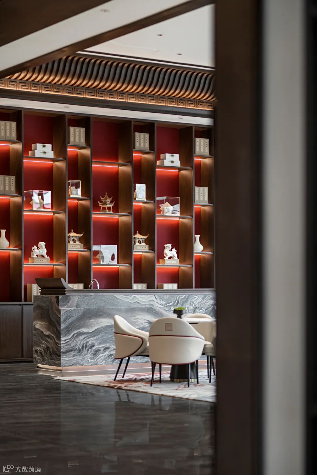 点缀着漆器红的洽谈区,犹如在深巷里的灯火缓缓的醒来了,清浅的风抚拥着客人向前,向着时光的境走去,红色的书架似乎带着诗人的气息,将客人带入在微暮的绕梁余韵中。