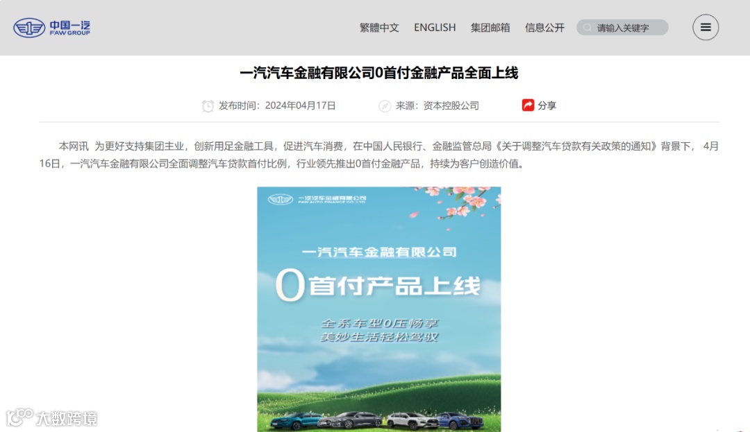 4月17日,据中国一汽官网消息,一汽汽车金融有限公司全面调整汽车贷款首付比例,推出“0首付”金融产品。此外,东风汽车金融有限公司、天津长城滨银汽车金融有限公司、奇瑞徽银汽车金融股份有限公司、大众汽车金融(中国)有限公司等均于近期“官宣”上线“0首付”金融产品。