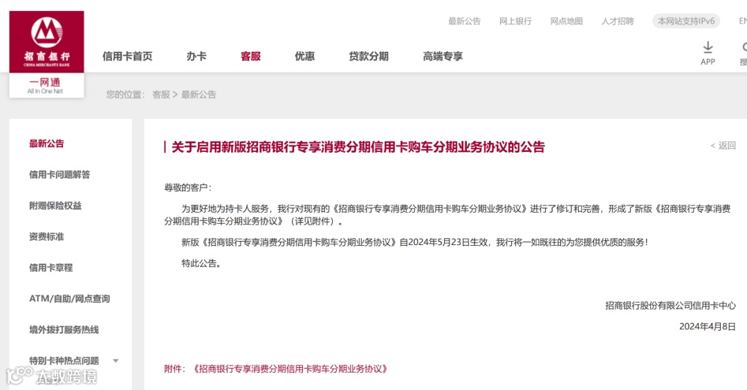 招商银行信用卡中心官网显示,将于5月23日启用新版《招商银行专享消费分期信用卡购车分期业务协议》。新版协议将还款模式从等本等息调整为等额本息。长期来看,有助于消费者节省更多利息成本。