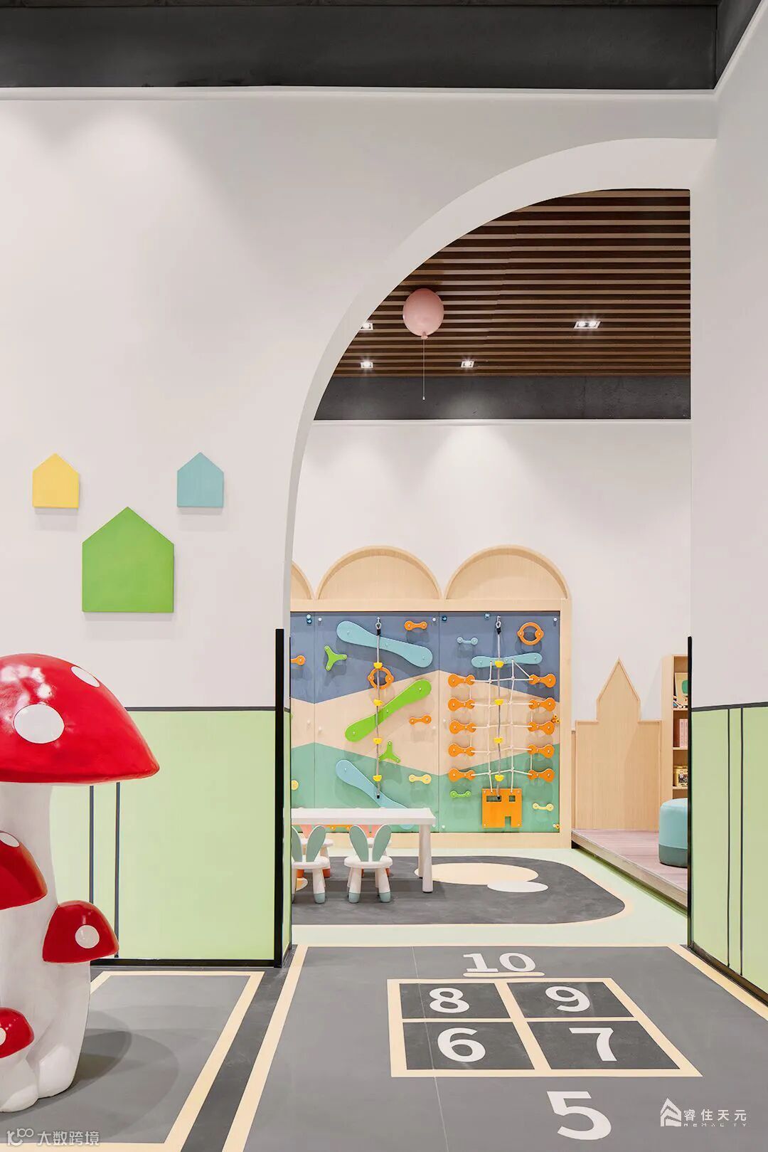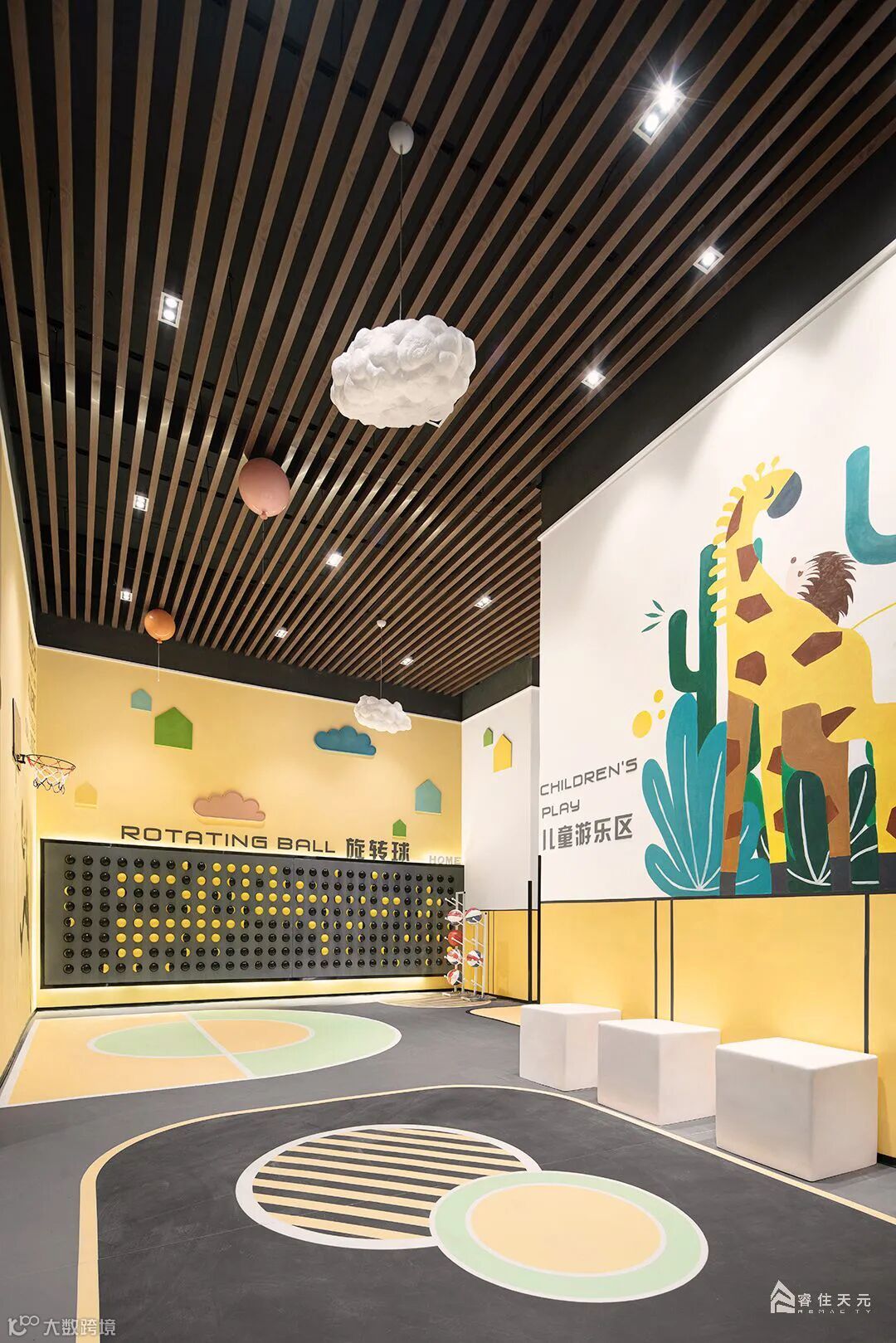 由于架空层光线的限制,通过色彩来激发视觉体验,把灰空间变为充满娱乐性的游戏场所,用色彩为孩子们编织出一场甜蜜的梦。