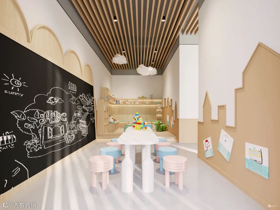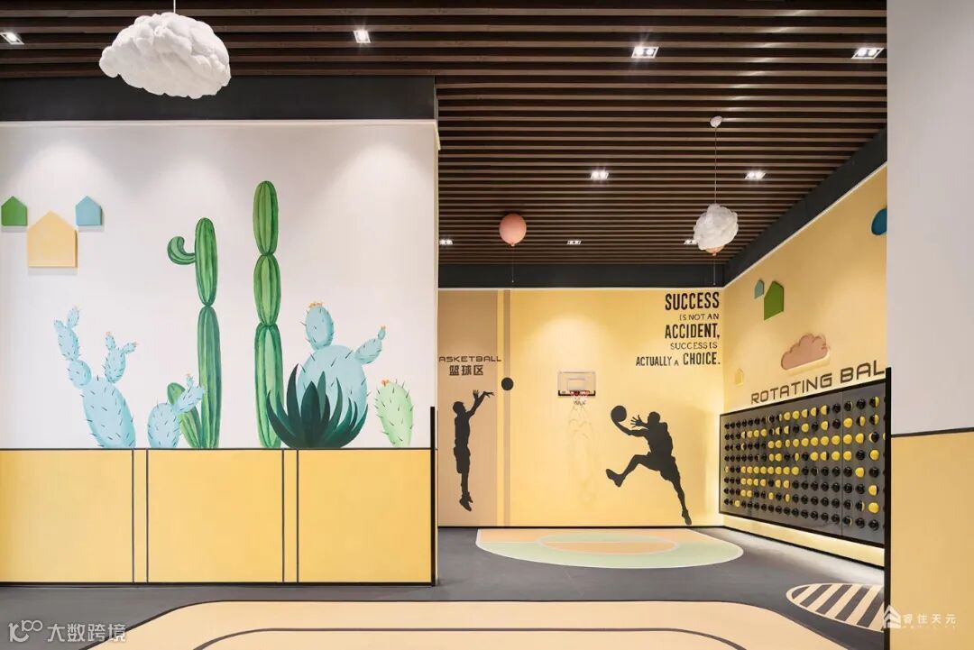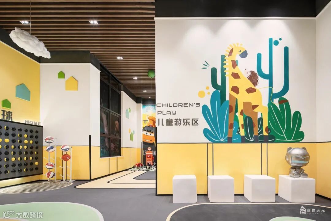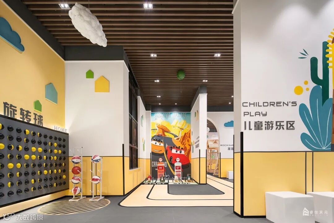 局部沙池造景让通透的空间更添趣味性,大幅的卡通墙绘和明亮的色彩灯光引人入胜,开启儿童娱乐的梦想之旅。