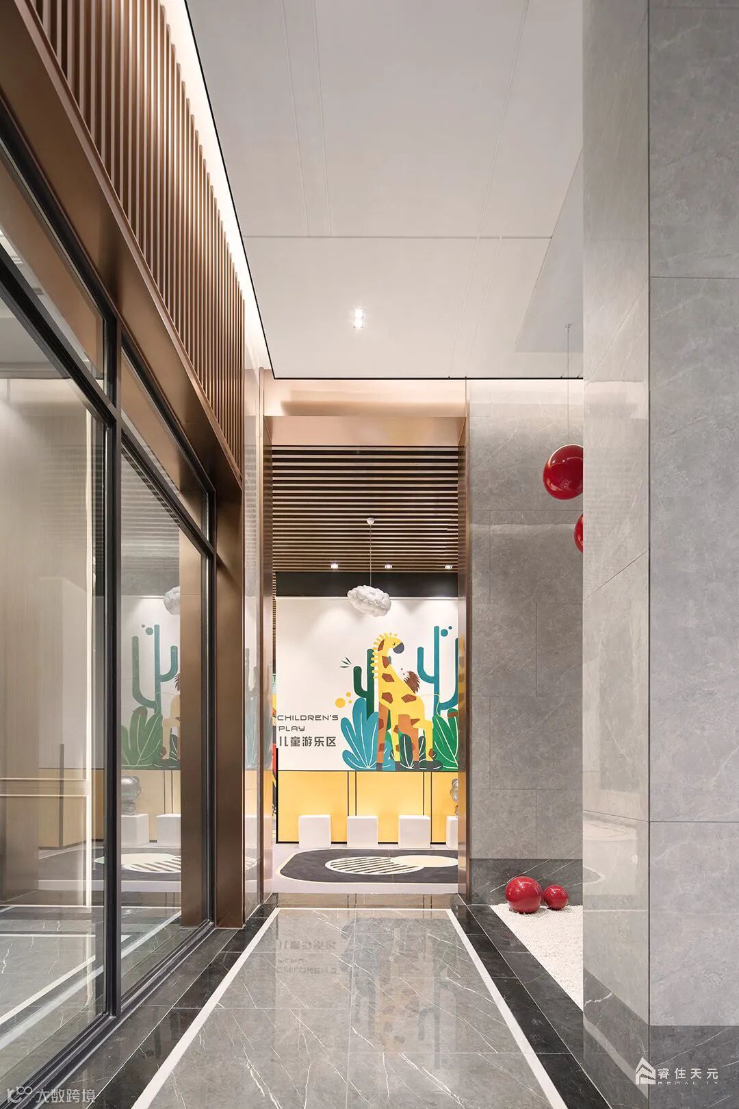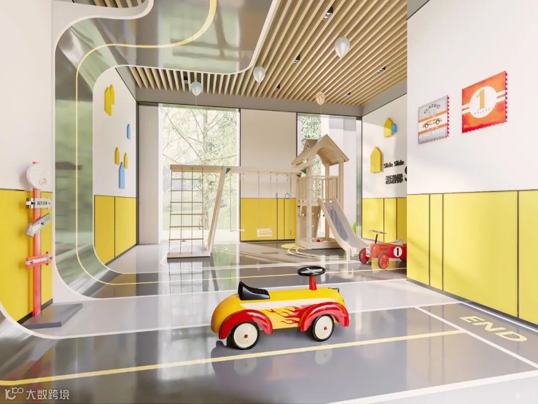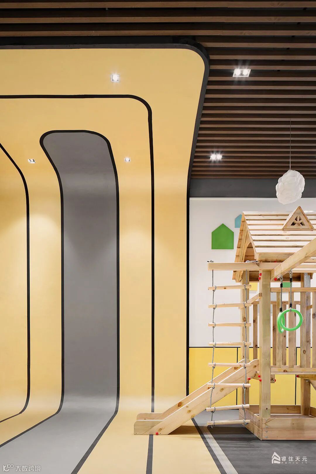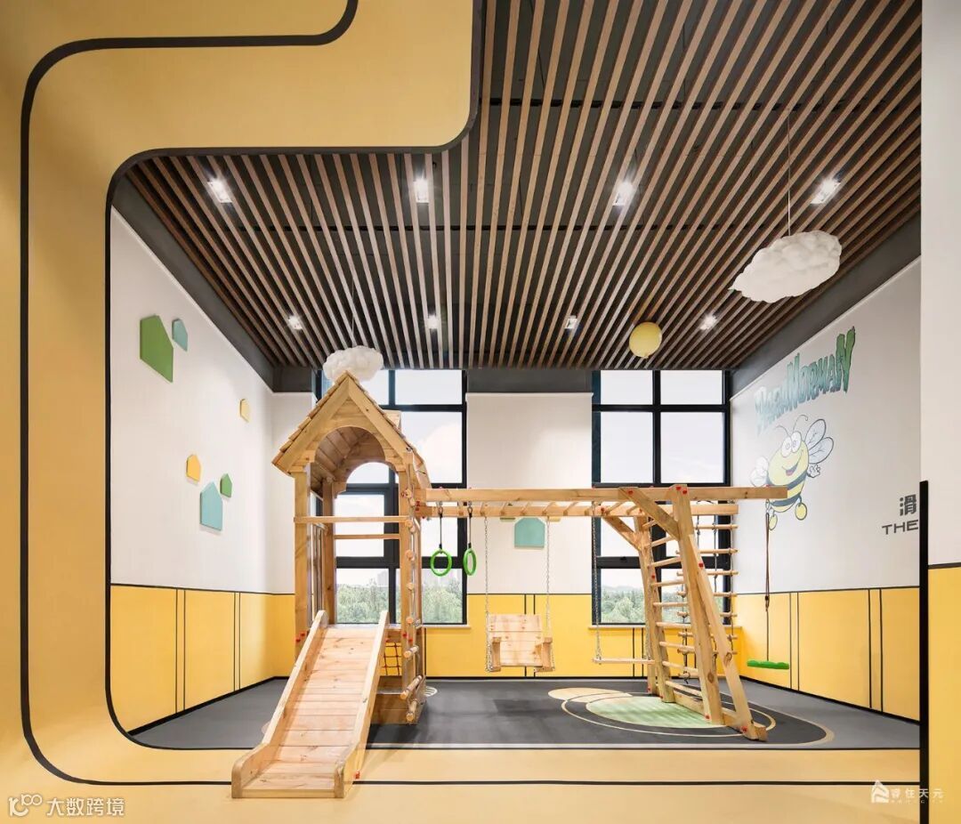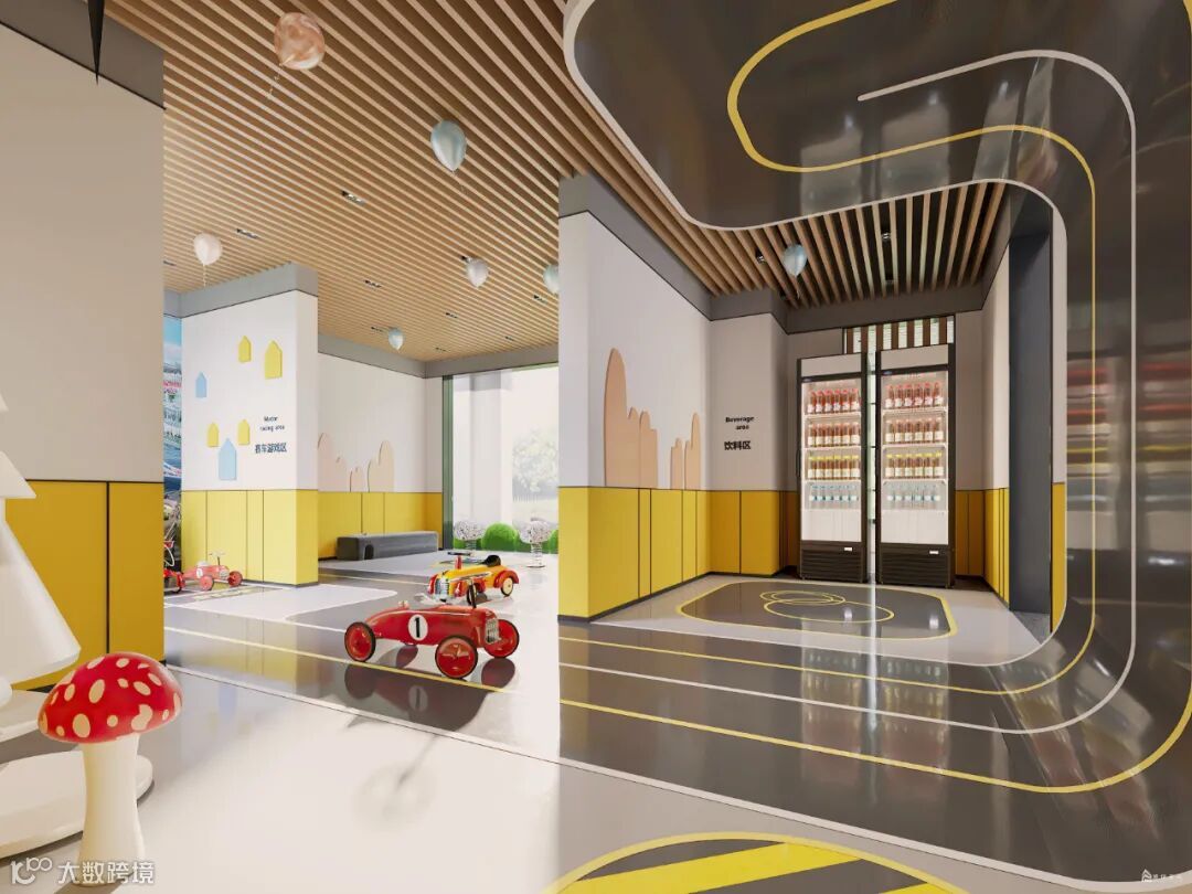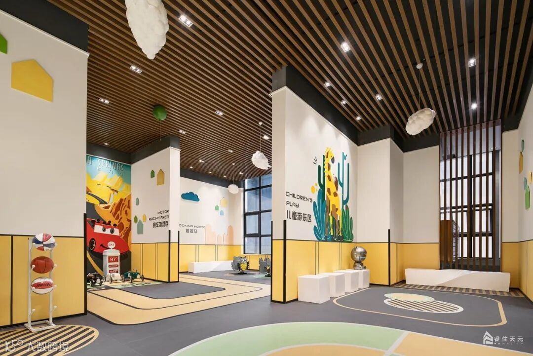 空间以黄色调为基色,以趣味性、运动性为主,既有地面跑道、篮球区、滑梯、摇摇马等这些游乐设施,可以肆意玩耍奔跑。入口两侧有序列的灯投射柔和的光芒,与水波辉映,令归家的路途温馨雅致。