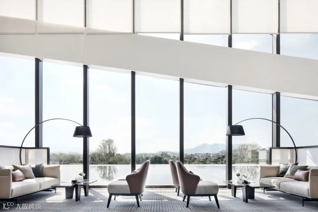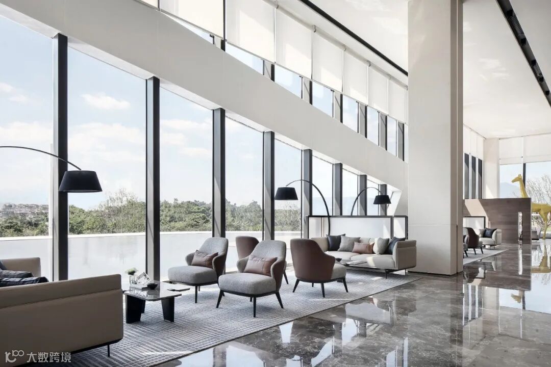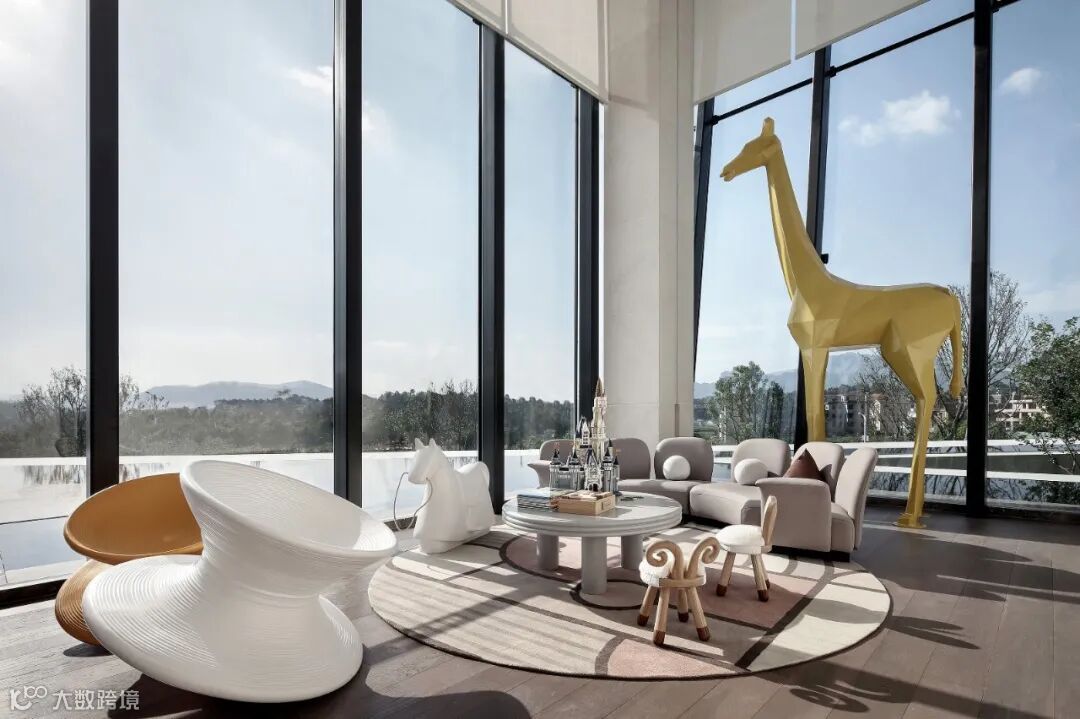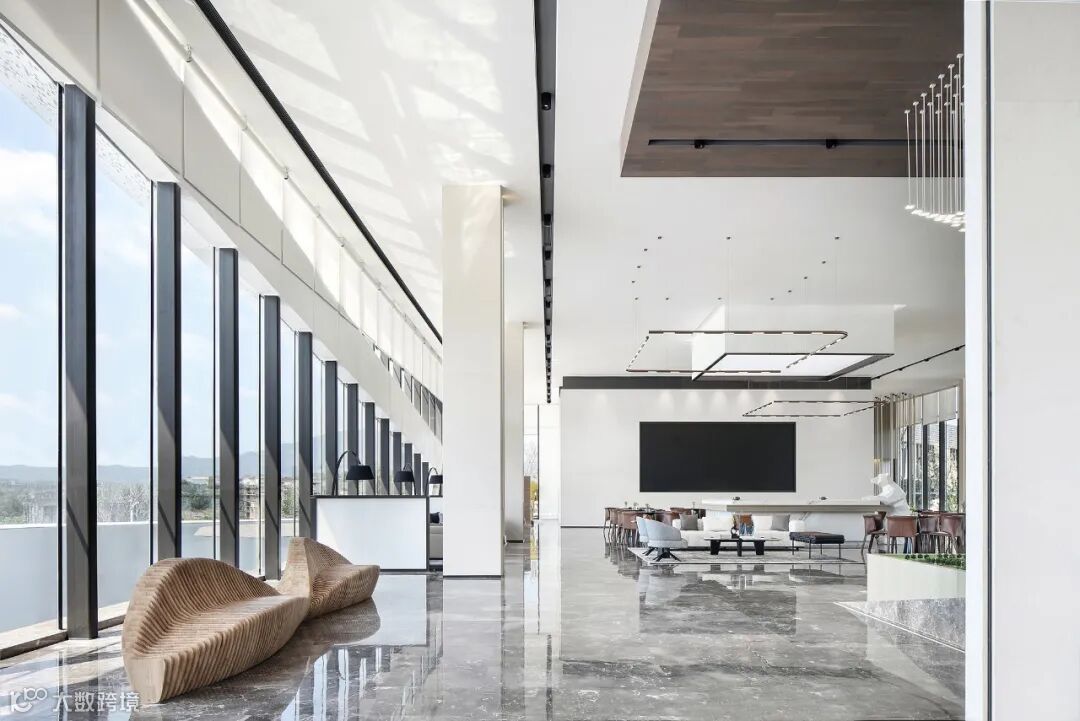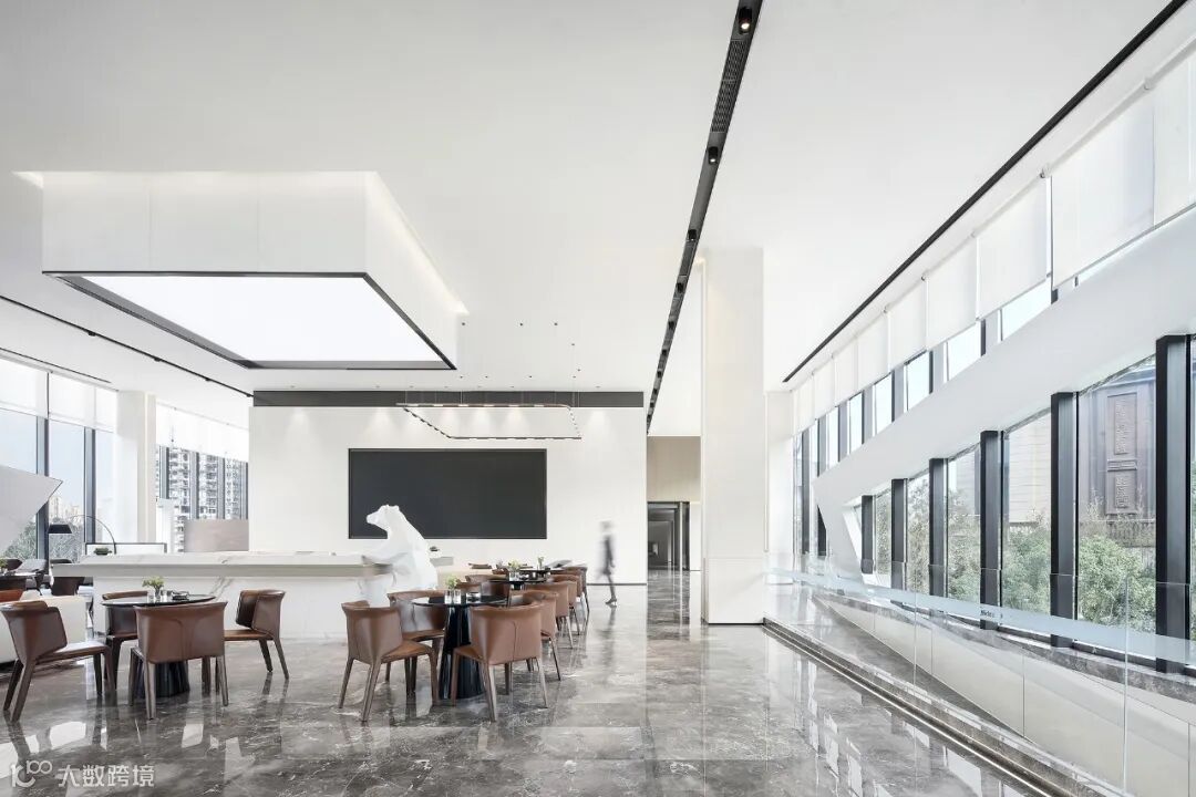 以大面积落地窗围合而成的二层空间,给观者高阔大气、豁然开朗的视觉享受。室外景观穿透玻璃融入室内,以人眼为媒介,重构空间,营造出丰满、生动的空间动态。