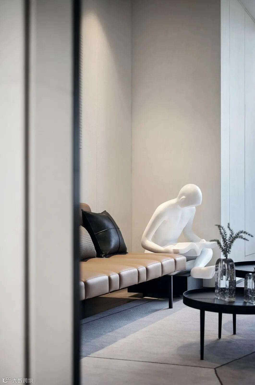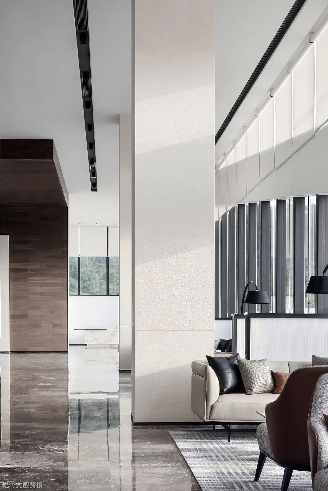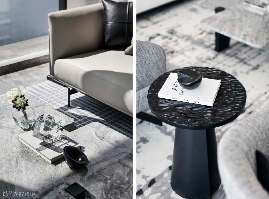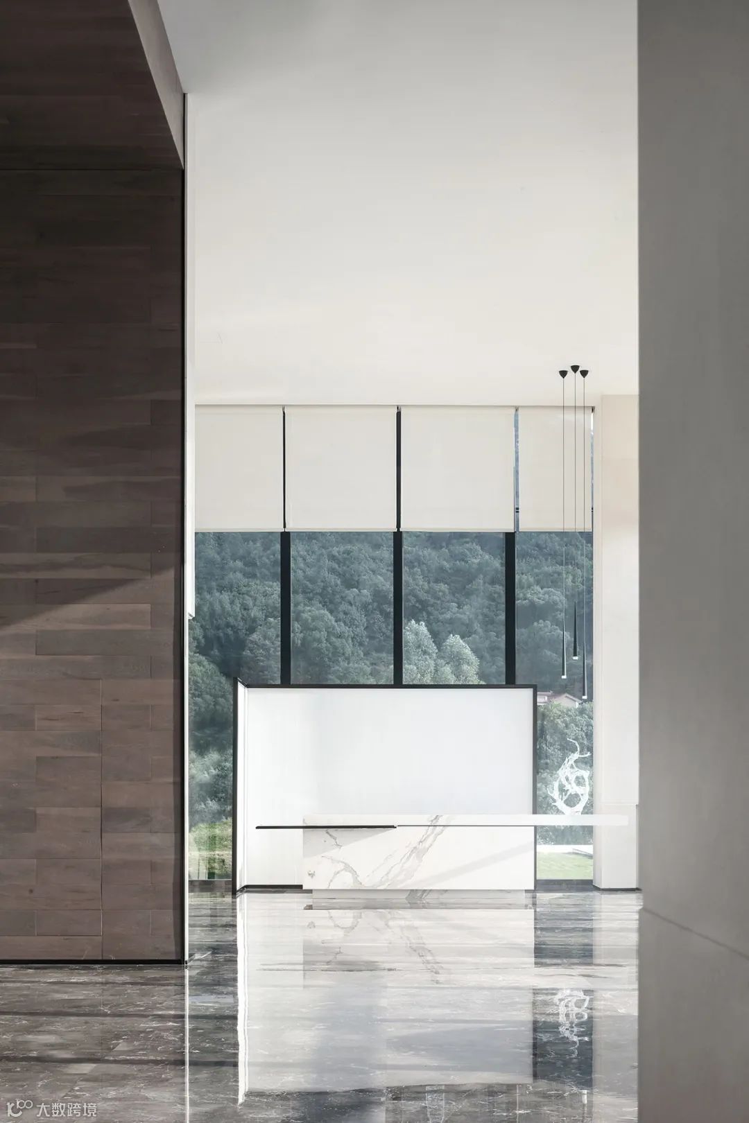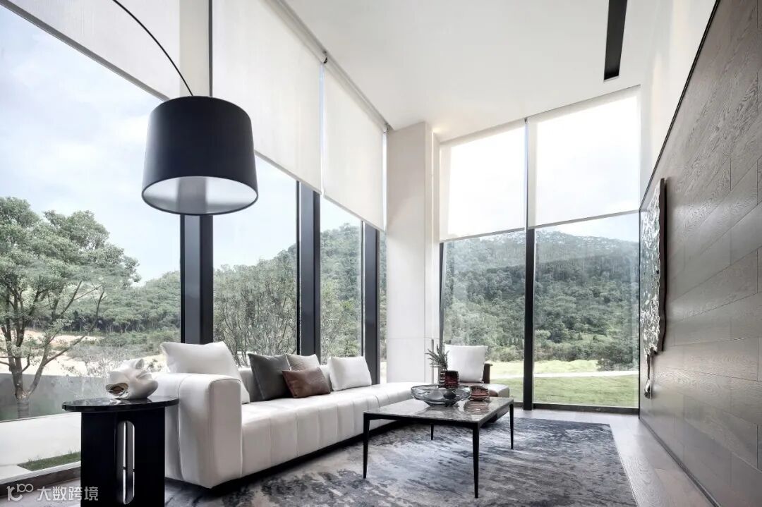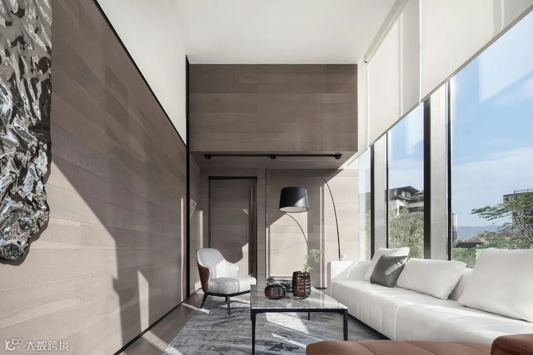 设计师秉承着“less is more”为设计理念,通过室内装饰的“少”,运用落地窗的透明特性,将建筑园林水景、自然光影、远山等从视觉纳入室内,令人的感观由室内延伸至室外极远处,以此营造空间的“多”。