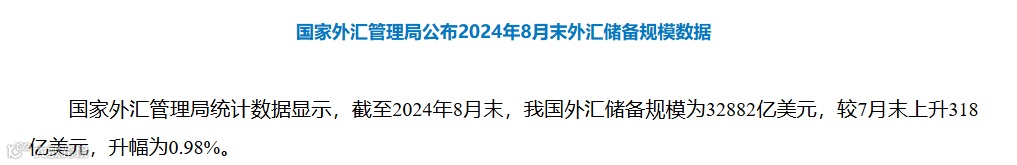 国家外汇管理局9月7日公布数据显示,截至2024年8月末,我国外汇储备规模为32882亿美元,较7月末上升318亿美元,升幅为0.98%。