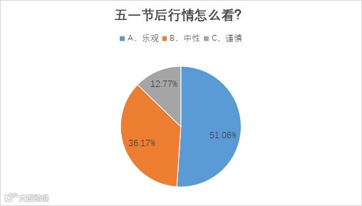 对于“五一”假期后的市场表现,私募排排网调查结果显示,51.06%的私募持乐观态度,认为一季报落地叠加政策面效果逐步显现,看好节后A股行情;36.17%的私募对节后行情持中性态度,认为市场可能会延续震荡;仅有12.77%的私募对“五一”后的市场表现持谨慎态度。