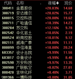 低空经济板块今日继续放量上攻。金盾股份、安达维尔、交控科技“20CM”涨停,苏交科、广哈通信等个股涨超10%。