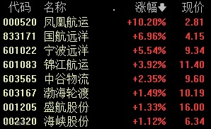凤凰航运在收盘前一刻钟内直线拉升并涨停,国航远洋、宁波远洋等股跟涨。