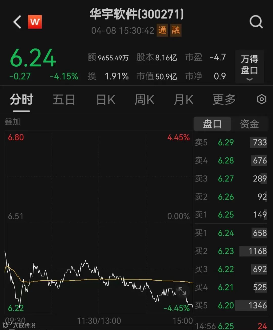 Wind数据显示,截至4月8日收盘,华宇软件股价报6.24元/股,跌幅4.15%。