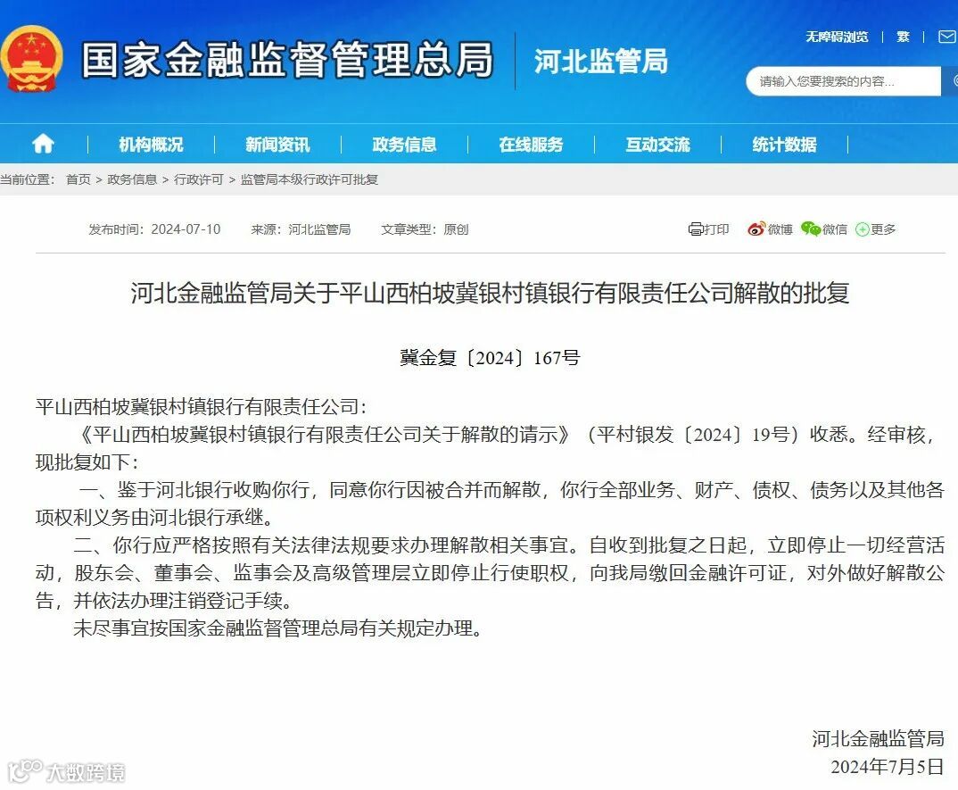 金融监管总局官网披露消息显示,日前,河北平山西柏坡冀银村镇银行被河北金融监管局批准解散。