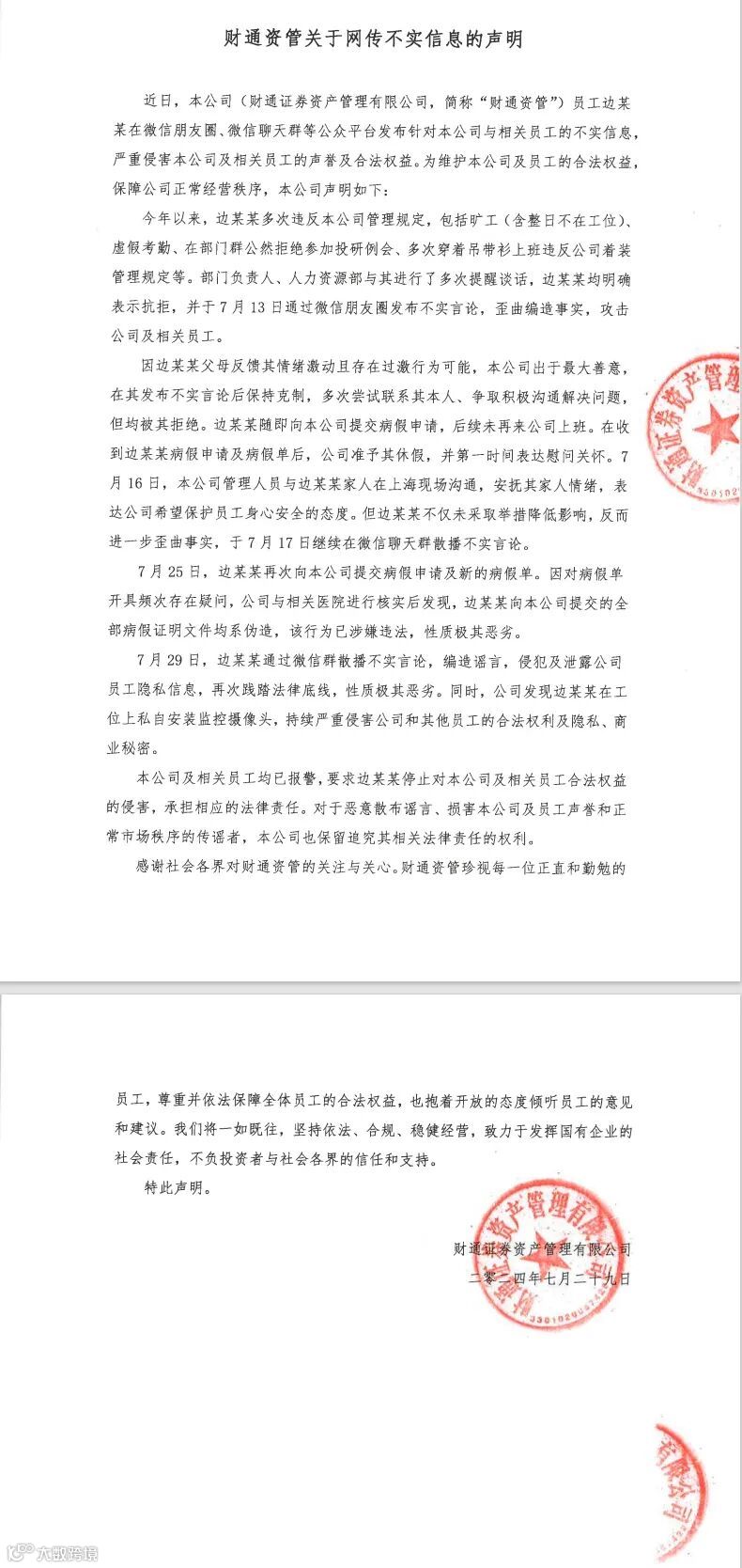 对此,财通资管发表声明称,近日,公司员工边某某在微信朋友圈、微信聊天群等公众平台发布针对公司与相关员工的不实信息,严重侵害公司及相关员工的声誉及合法权益。