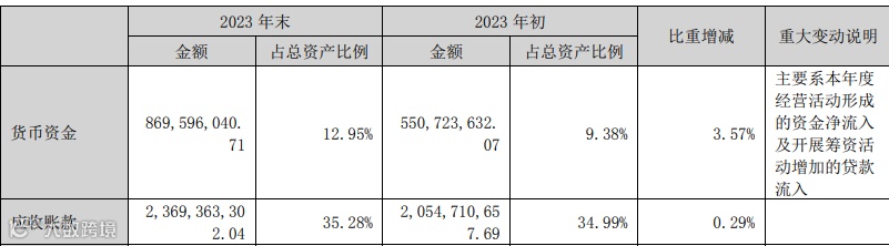 截至2023年末,公司应收账款金额高达23.69亿元,占总资产比例为35.28%。