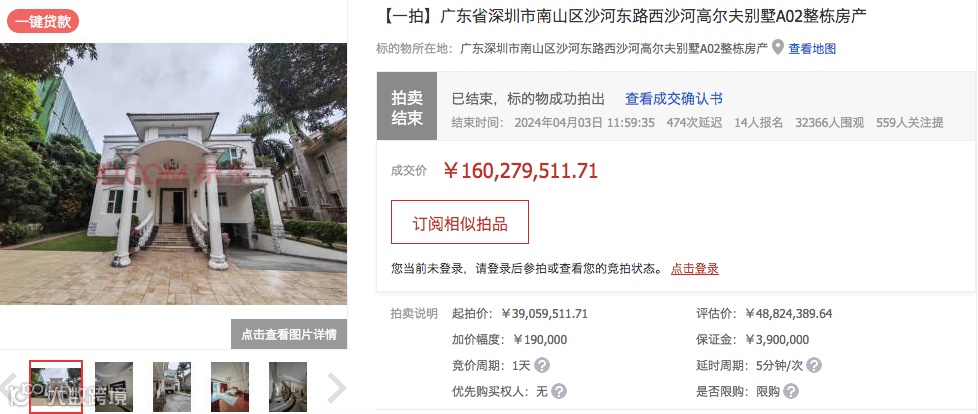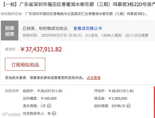 此外,香蜜湖水榭花都204.9平米房源起拍价2046万元,成交价4126万元;香蜜湖一号319.7平米房源起拍价3091万元,成交价6417万元;深圳湾瑞府(公寓)398平米房源起拍价5768万元,成交价7401万元;纯水岸联排别墅起拍价8280万元,成交价1亿元。