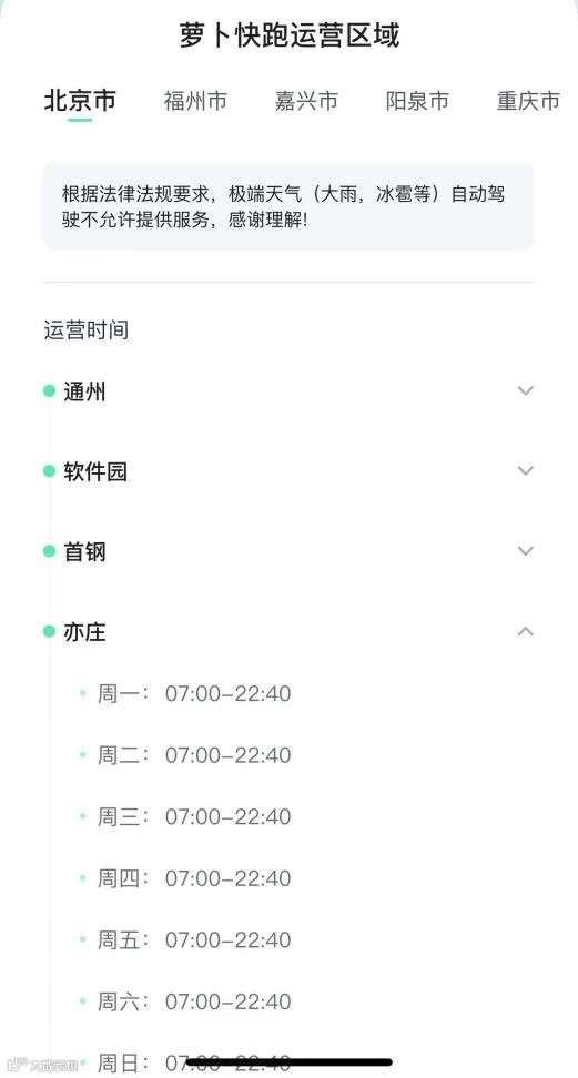 此外,极端天气对萝卜快跑也是一个挑战。7月12日,北京下午为雷暴雨天气,萝卜快跑APP显示“根据法律法规要求,极端天气(大雨、冰雹等)自动驾驶不允许提供服务,感谢理解”。大雨时段通常网约车运力不足、打车需求多,自动驾驶车辆暂时不能弥补天气特殊时的运力供给不足。