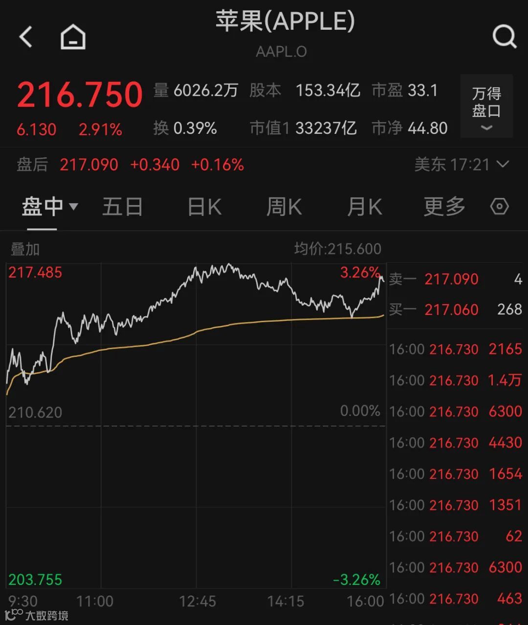 科技股领涨,纳指创收盘历史新高。苹果收涨2.91%,报216.75美元/股,创收盘历史新高。