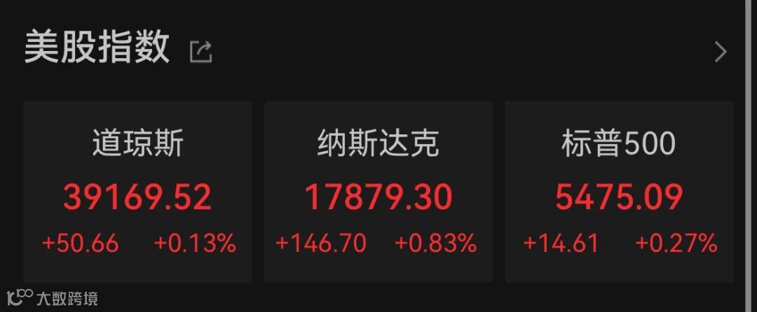 ,美国三大股指全线收涨。截至收盘,道指涨0.13%报39169.52点,标普500指数涨0.27%报5475.09点,纳指涨0.83%报17879.3点。