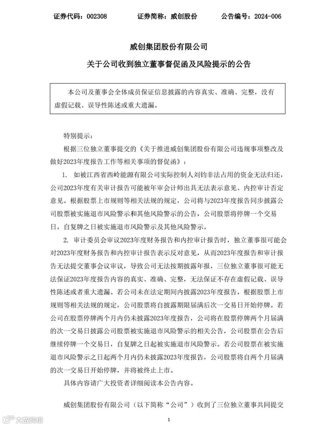 按照计划,威创股份拟于4月29日披露2023年度报告。对威创股份目前被立案事项以及其他公司违规对外投资和违规大额资金支付等违规事项,三位独立董事重申,如果被刘钧擅自占用的公司13.3亿元资金没有及时归还公司,2023年度有关审计报告可能被年审会计师出具无法表示意见、内控审计否定意见。