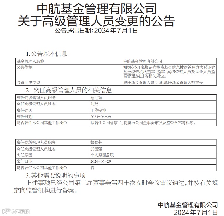 7月1日,中航基金发布公告称,总经理刘建因工作安排已于6月29日离任,拟转任公司督察长,将履行公司董事会审议及监管备案等程序。此外,原督察长武国强因个人原因于6月29日辞职,不再转任公司其他工作岗位。