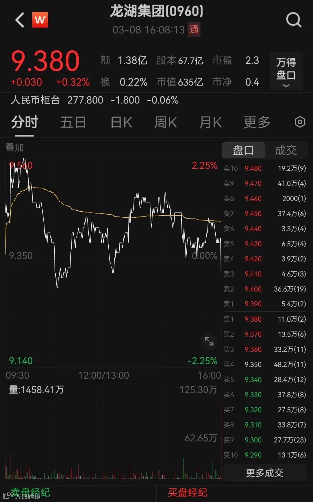 Wind数据显示,3月8日,龙湖集团股价收报9.38港元/股,涨幅为0.32%。