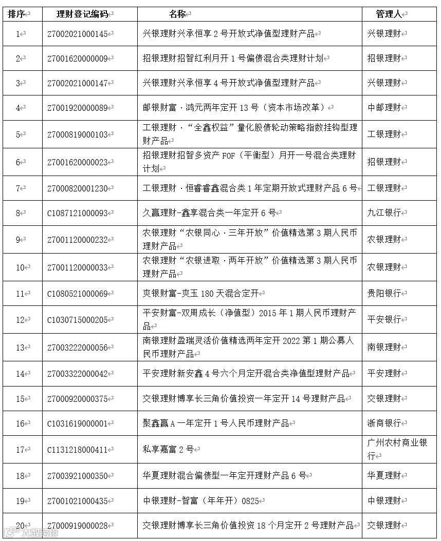 本榜单使用的数据覆盖了市场上大部分银行理财产品,数据库包含的银行理财产品总规模达26.80万亿元。原则上入围榜单的理财产品规模需达到8000万元及以上。考虑到混合类理财产品规模整体较小,且极个别理财产品表现突出,该条件可酌情放宽。同一机构如果有多个产品入围榜单,仅选取同系列中排名最高的产品,且入围产品总数原则上不超过2个。
