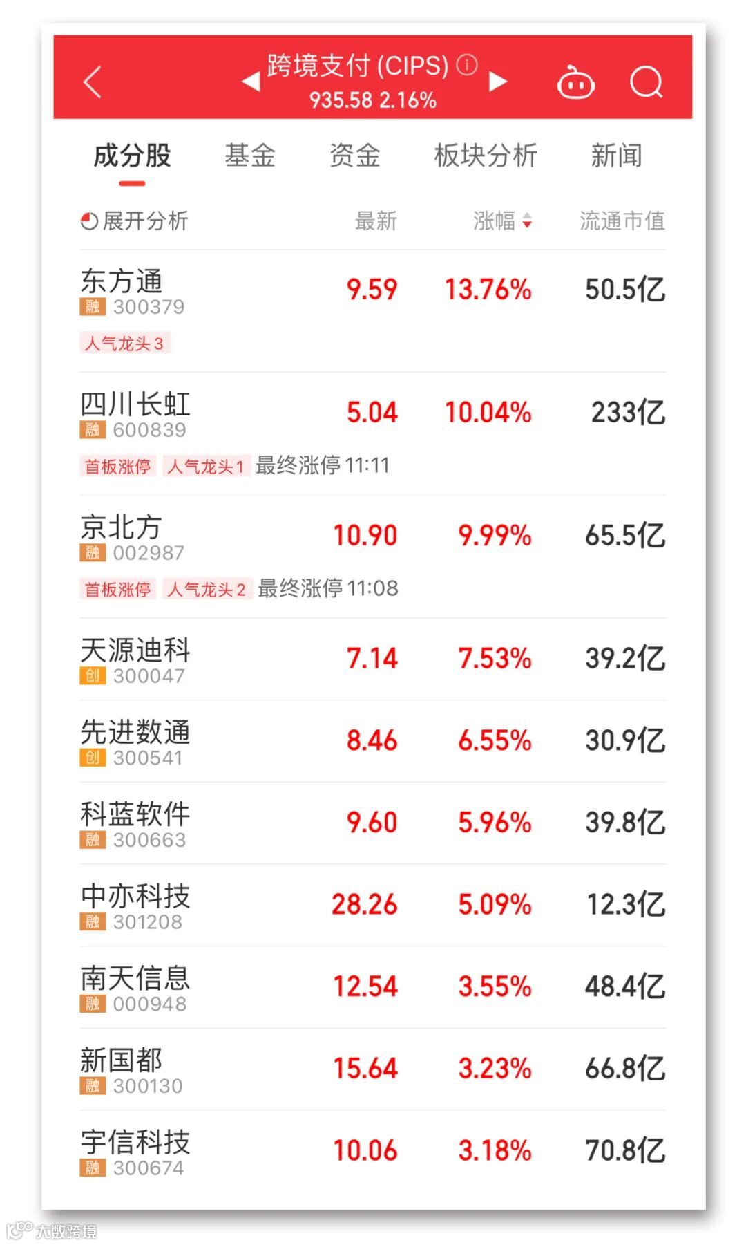 受利好消息刺激,跨境支付概念今日再度上涨。人气龙头带动板块内个股多数上涨,东方通盘中一度涨超17%,京北方涨停,天源迪科涨超7%。