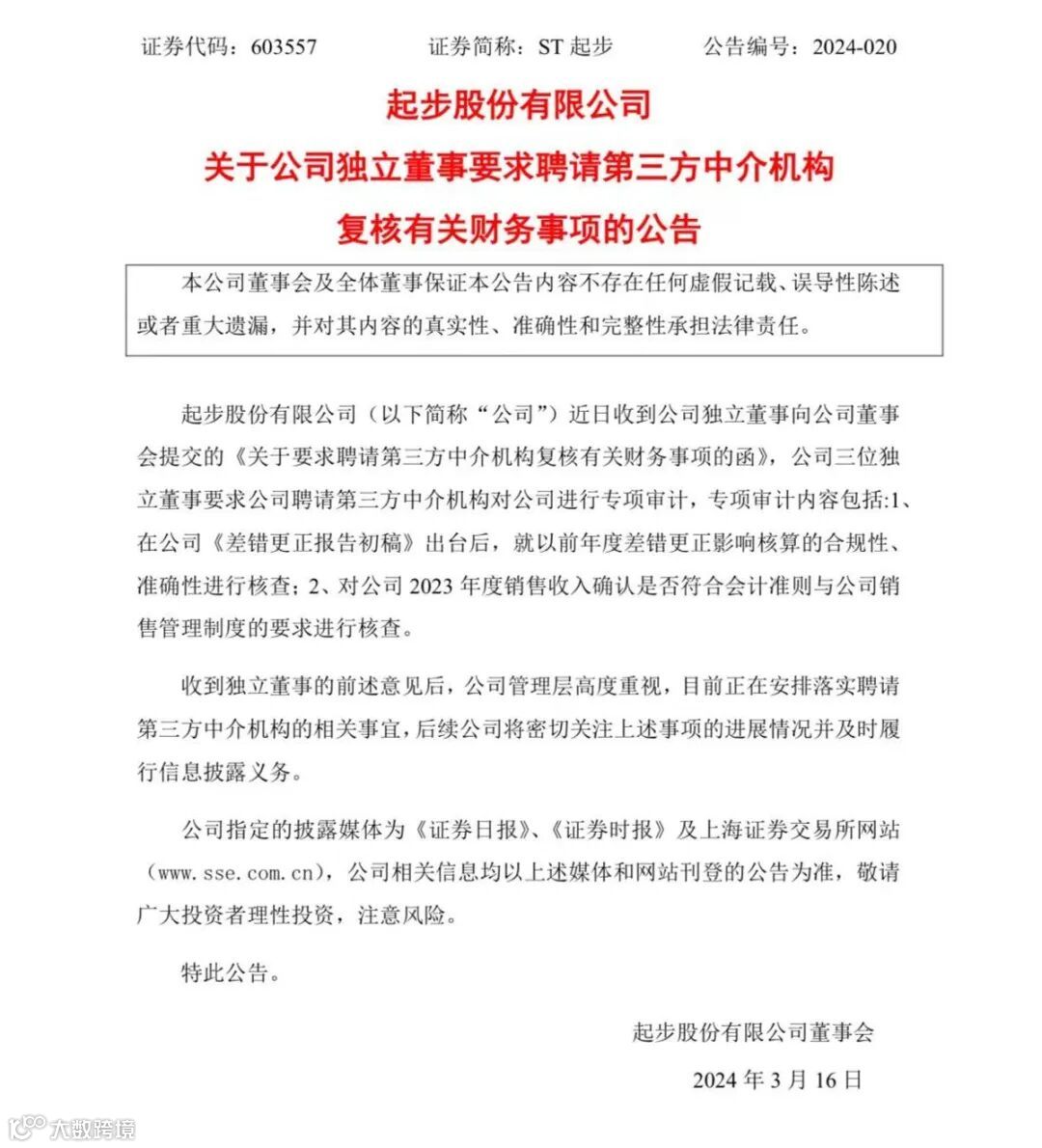 ST起步称,预计2024年3月下旬出具差错更正报告初稿,也即此次独立董事要求专项审计的内容 。